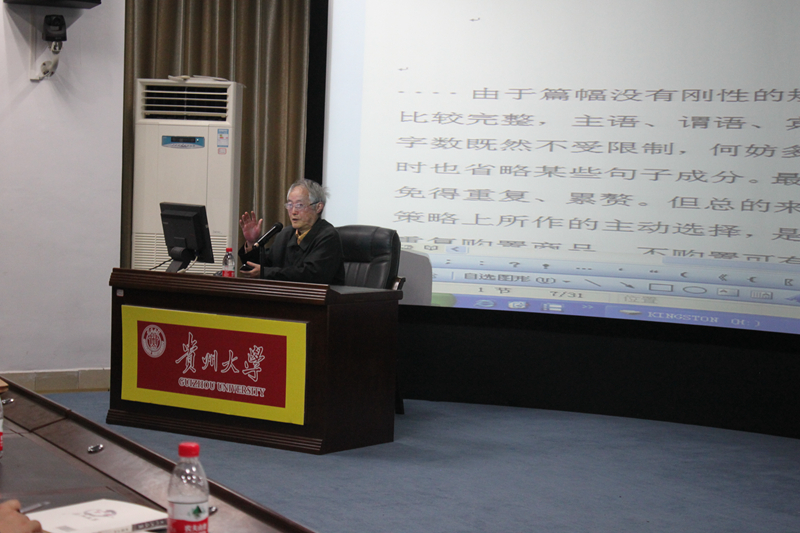 4月5日下午3时,贵州大学2017年第14期文科讲坛(总第390期)——“古典诗词的理解与误解”专题讲座在贵州大学北校区慎思楼情景模拟实验室举行,讲座由南京师范大学博士生导师、中国韵文学会会长钟振振教授主讲。我校文学与传媒学院副院长谭德兴教授主持讲座。