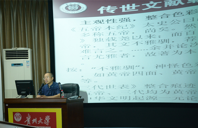 7月3日下午,以“历史与神话交融:中华早期文明的重要演进方式”为题的首场论坛在慎思楼情景模拟室顺利举行。文学与传媒学院副院长谭德兴教授担任主讲人,中文系主任张军教授主持了本次讲座。文学与传媒学院罗卫刚书记、董蔚然副书记、刘振宁副院长,部分教师,2014级中文系全体本科生学生及相关学院的部分学生共计140余人聆听了讲座。