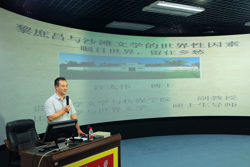贵大文学与传媒学院讯(文字:赵红 图片:谭敏)7月10日下午,由贵州大学文学与传媒学院主办的文学与传媒学院“博士论坛”(第二讲)在北校区慎思楼情景模拟实验室举行。文学与传媒学院副教授、比较文学与世界文学专业硕士生导师汪太伟作题为“黎庶昌与沙滩文学的世界性因素——瞩目世界 留住乡愁”的讲座。文学与传媒学院副院长刘振宁教授主持讲座。文学与传媒学院董蔚然副书记、杨世海副教授、姚亮副教授、杨媛老师,历史与民族文化学院朱兵副教授,2015级中文系全体本科生学生及相关学院的部分学生共计120余人聆听了讲座。
