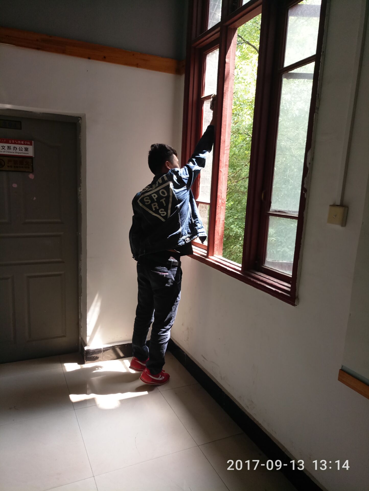 文学与传媒学院讯(董长虹报道 摄影文杰)为提高大学生创建文明城市、文明校园的意识,使创建活动人人皆知,形成人人参与的创建氛围,913日,文学与传媒学院团委学生会带头,组织同学开展清扫活动,将人文楼的楼道、窗户、教室等等逐一打扫干净,并清捡道路、绿化带边的垃圾。