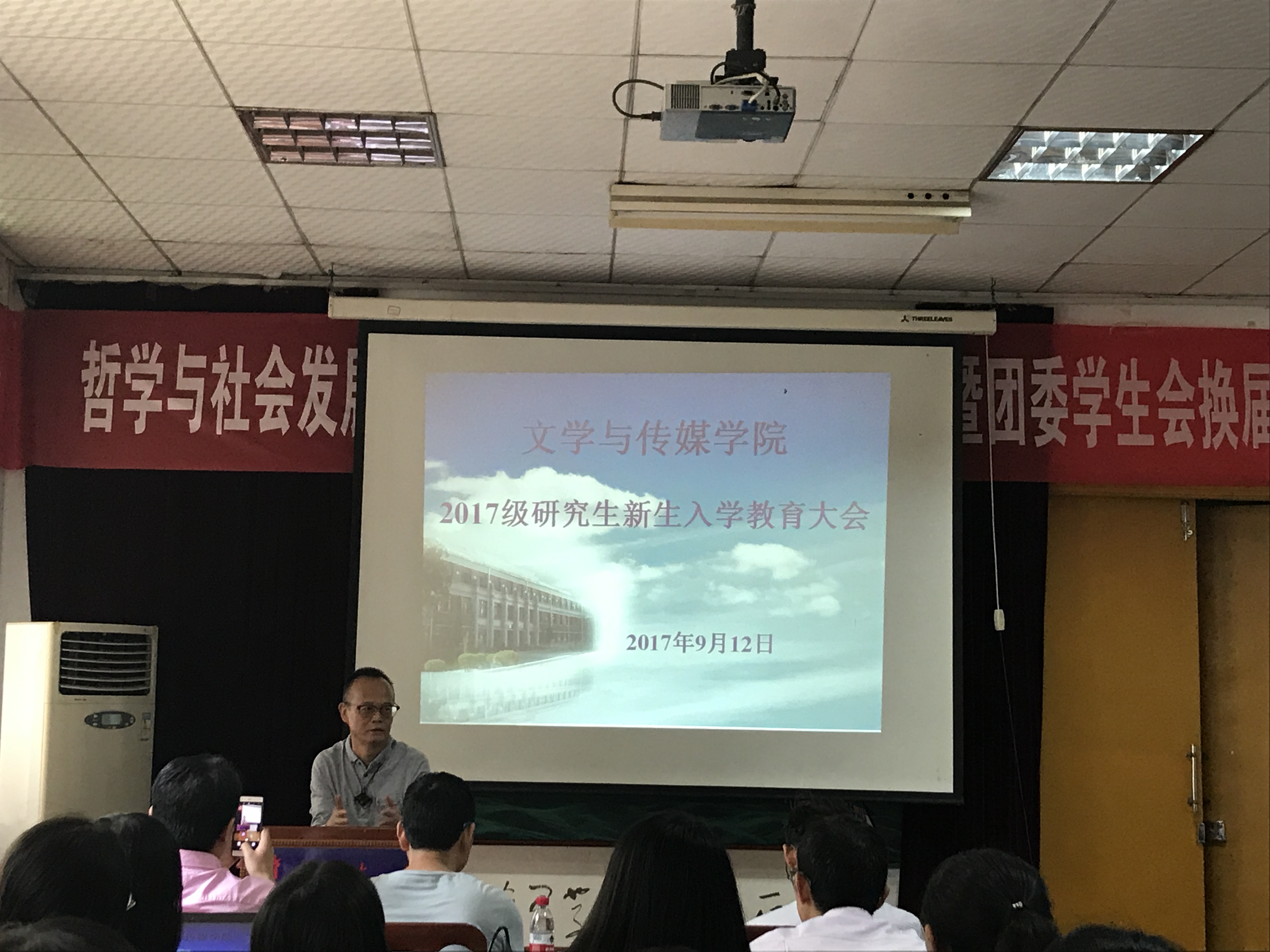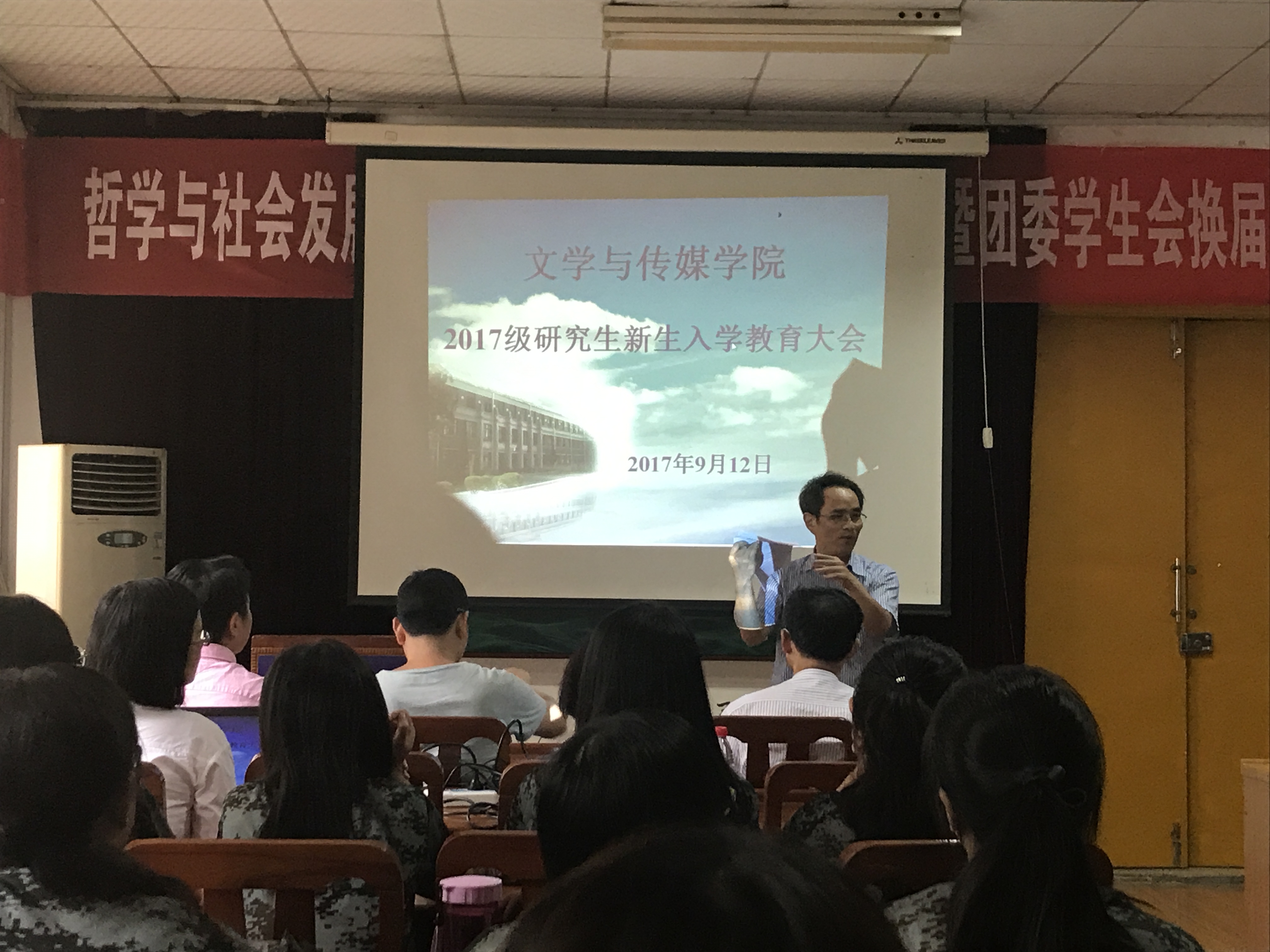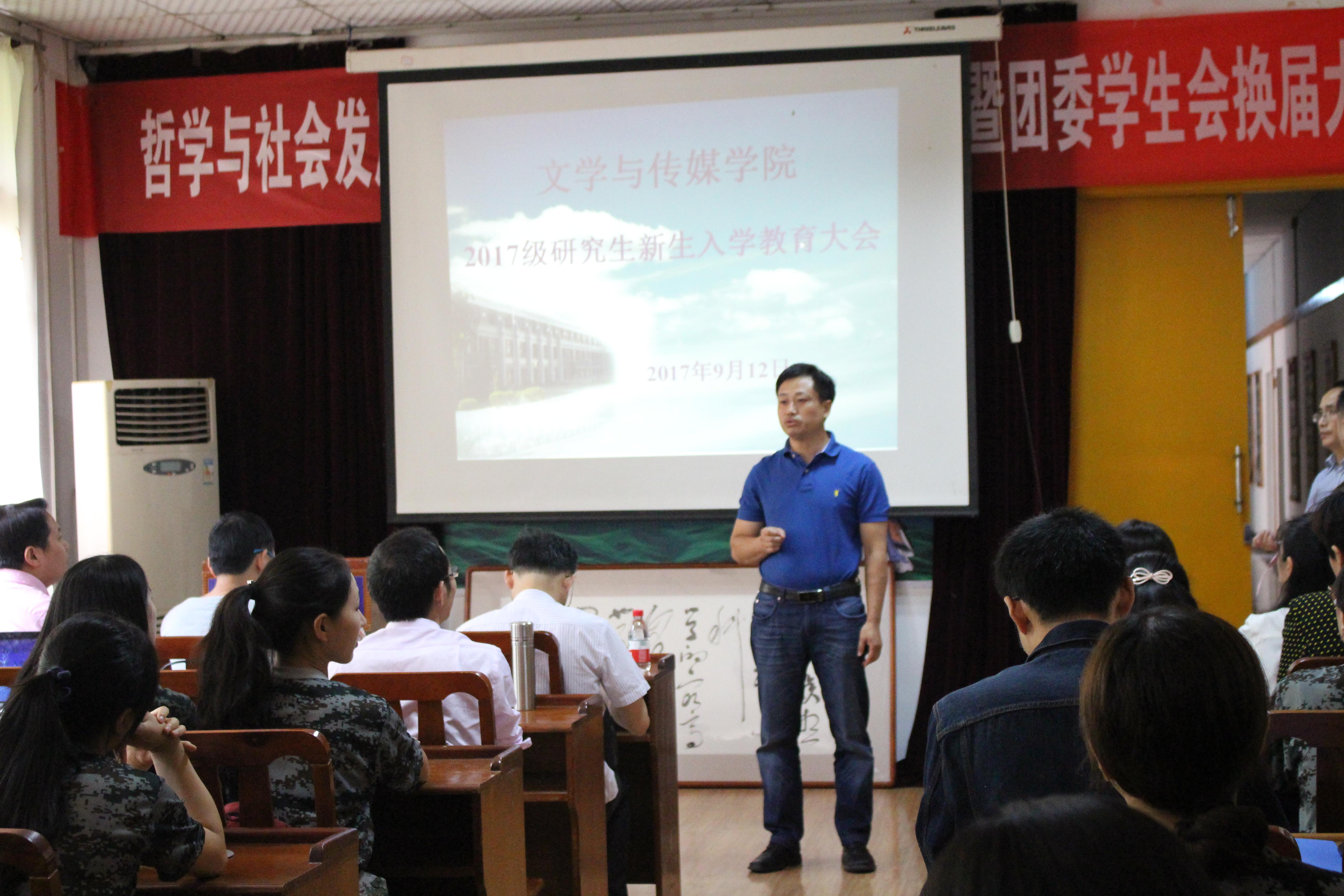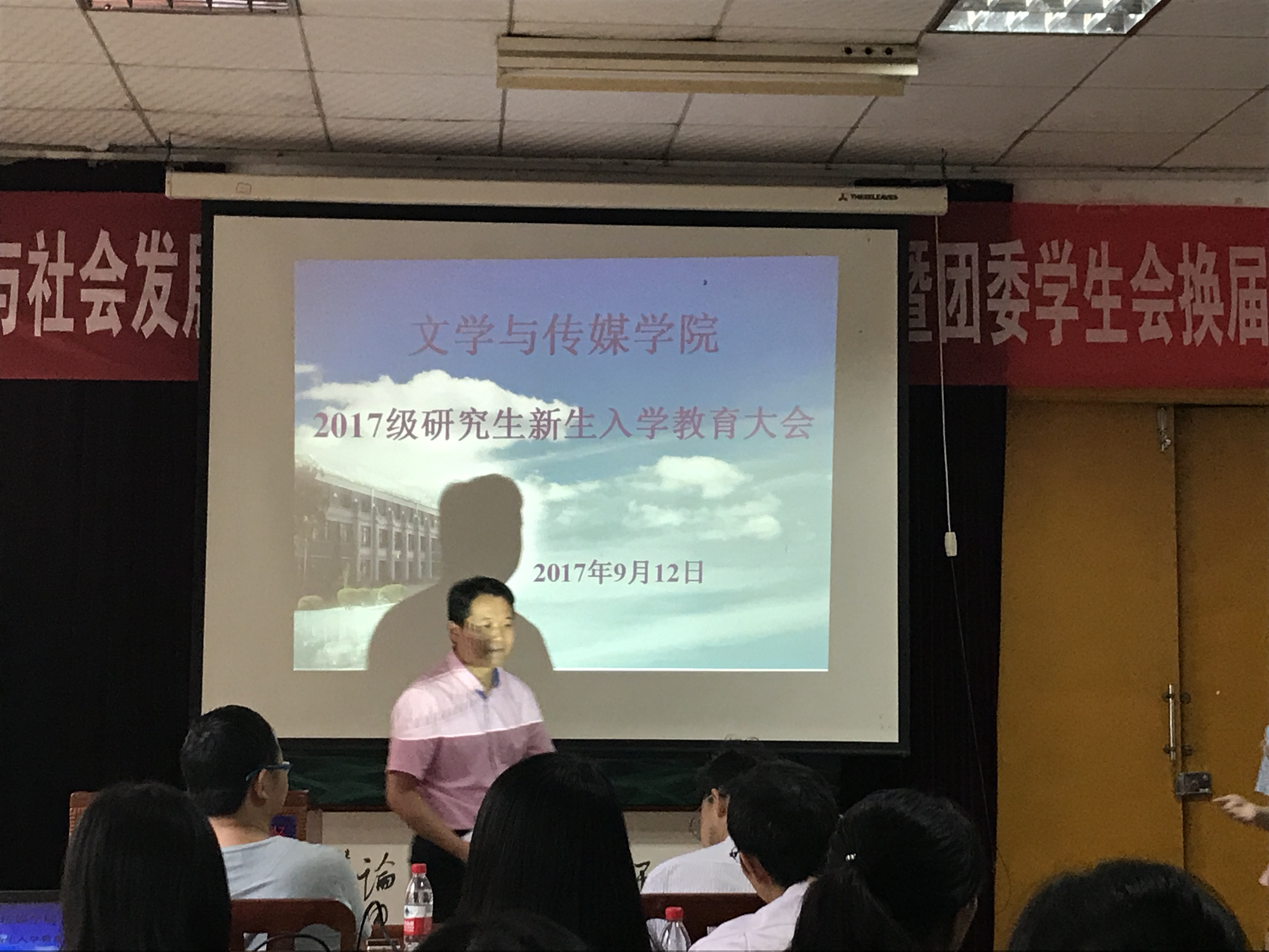 9月12日上午,文学与传媒学院2017级研究生入学教育大会在人文楼308教室举行,学院党委书记罗卫刚、副书记董蔚然,副院长刘振宁、谭德兴,全体研究生指导教师和学院科室负责人出席会议,2017级全体研究生同学参加会议。会议由副院长刘振宁主持。