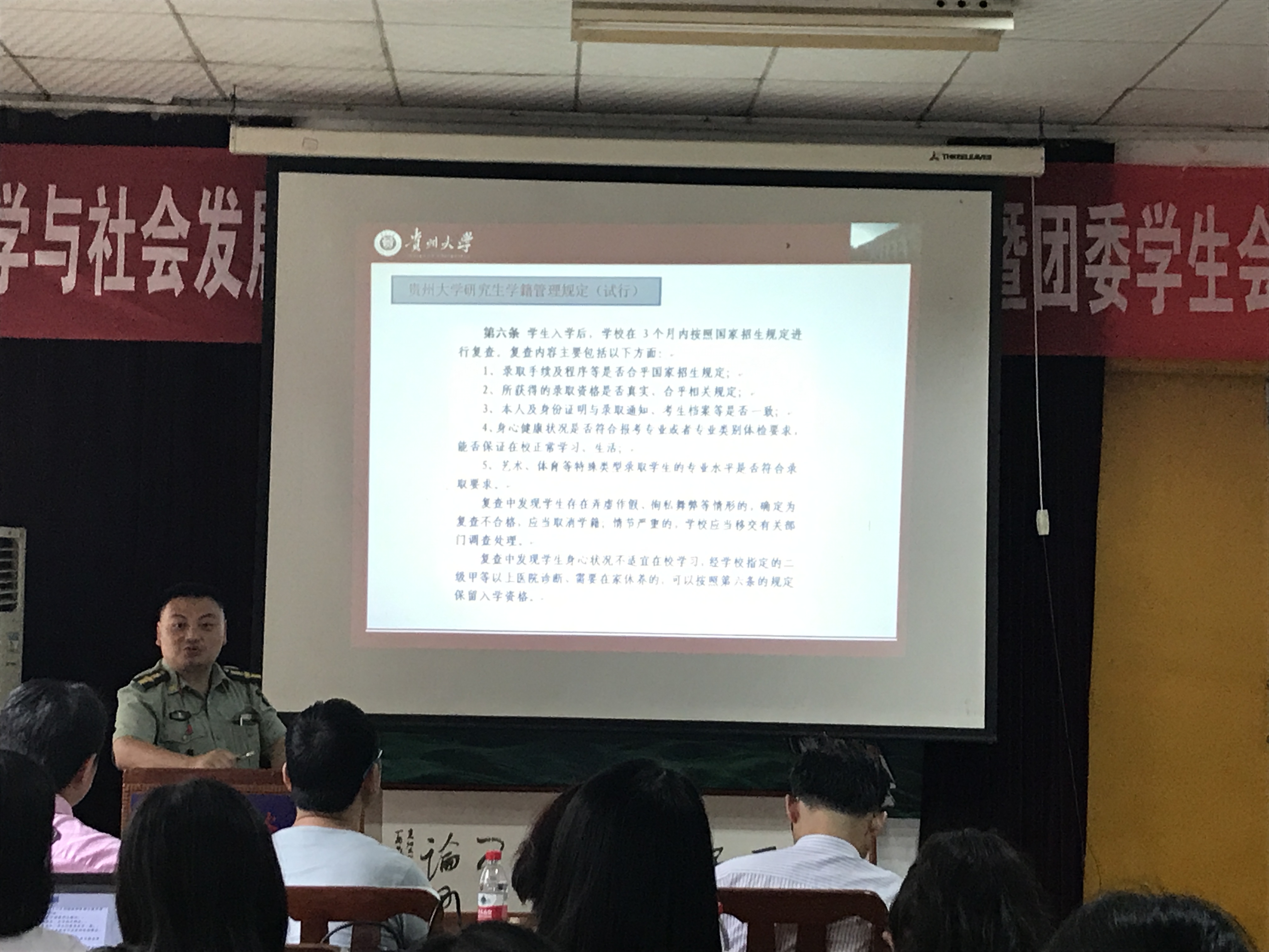 罗卫刚书记首先代表学院讲话,他向全体新生详细介绍了贵州大学的发展历程和取得的辉煌成就,介绍了学院概况和学科发展、师资队伍及研究生教育现状。他希望研究生同学要立志、勤学、修德,在老师的带领下成长成才。