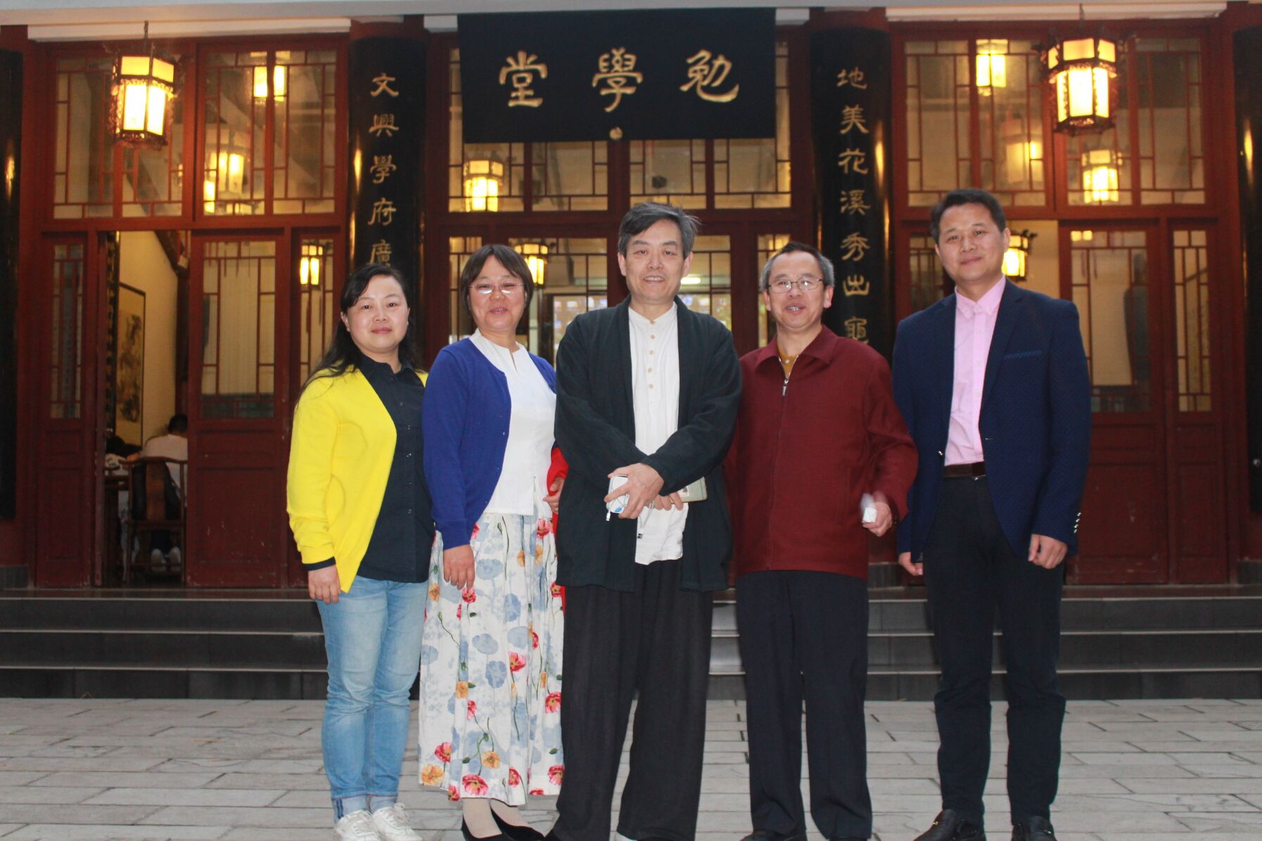 在讲座开始之前,文学与传媒学院杨仁厚院长、黄海教授、赵永刚副教授和胡晓明教授及夫人在勉学堂门口合影留念。