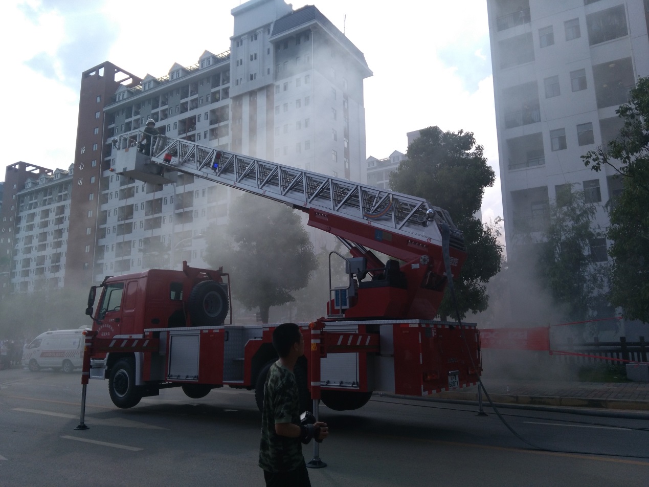 消防云梯从高处往下喷水,缓解因为高度不够造成的灭火压力。在多方努力下,“火势”得到控制,最终被扑灭。