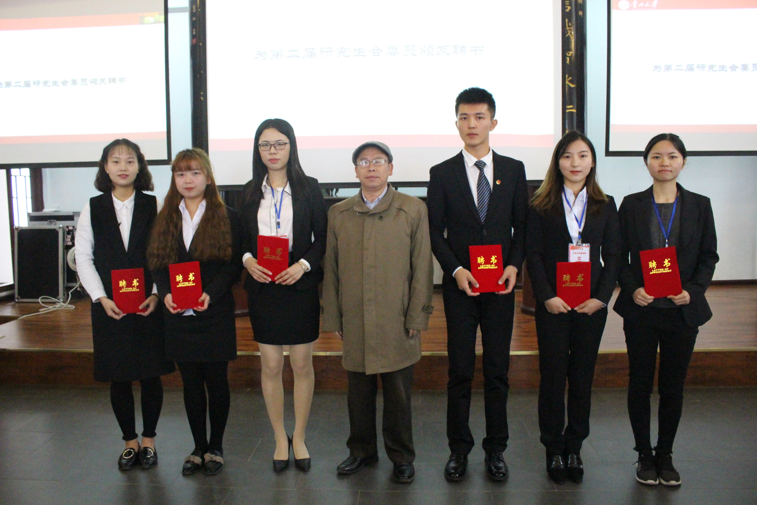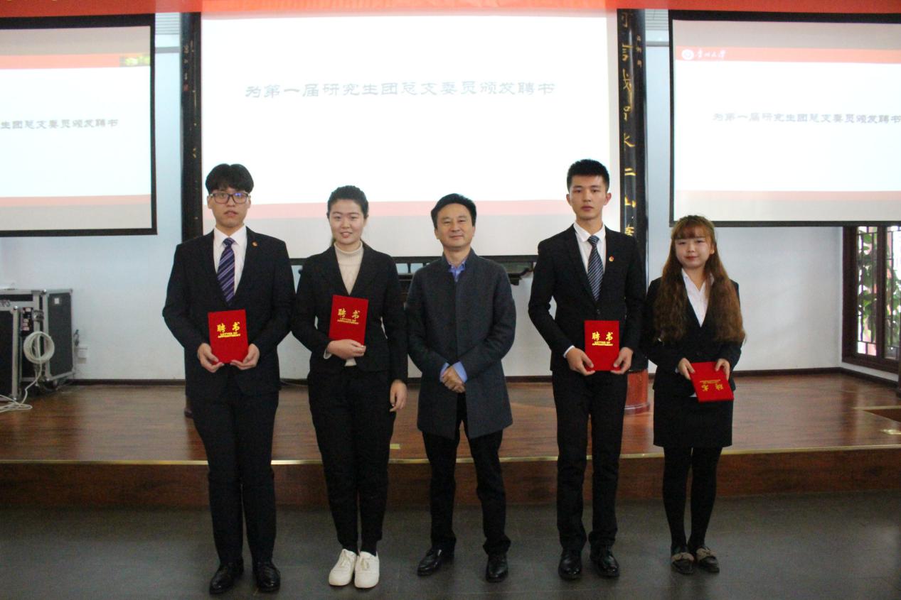 接下来,校党委研究生工作部罗勇部长、文学与传媒学院院长杨仁厚分别为文学与传媒学院第一届研究生团总支及第二届研究生会干部颁布聘书。