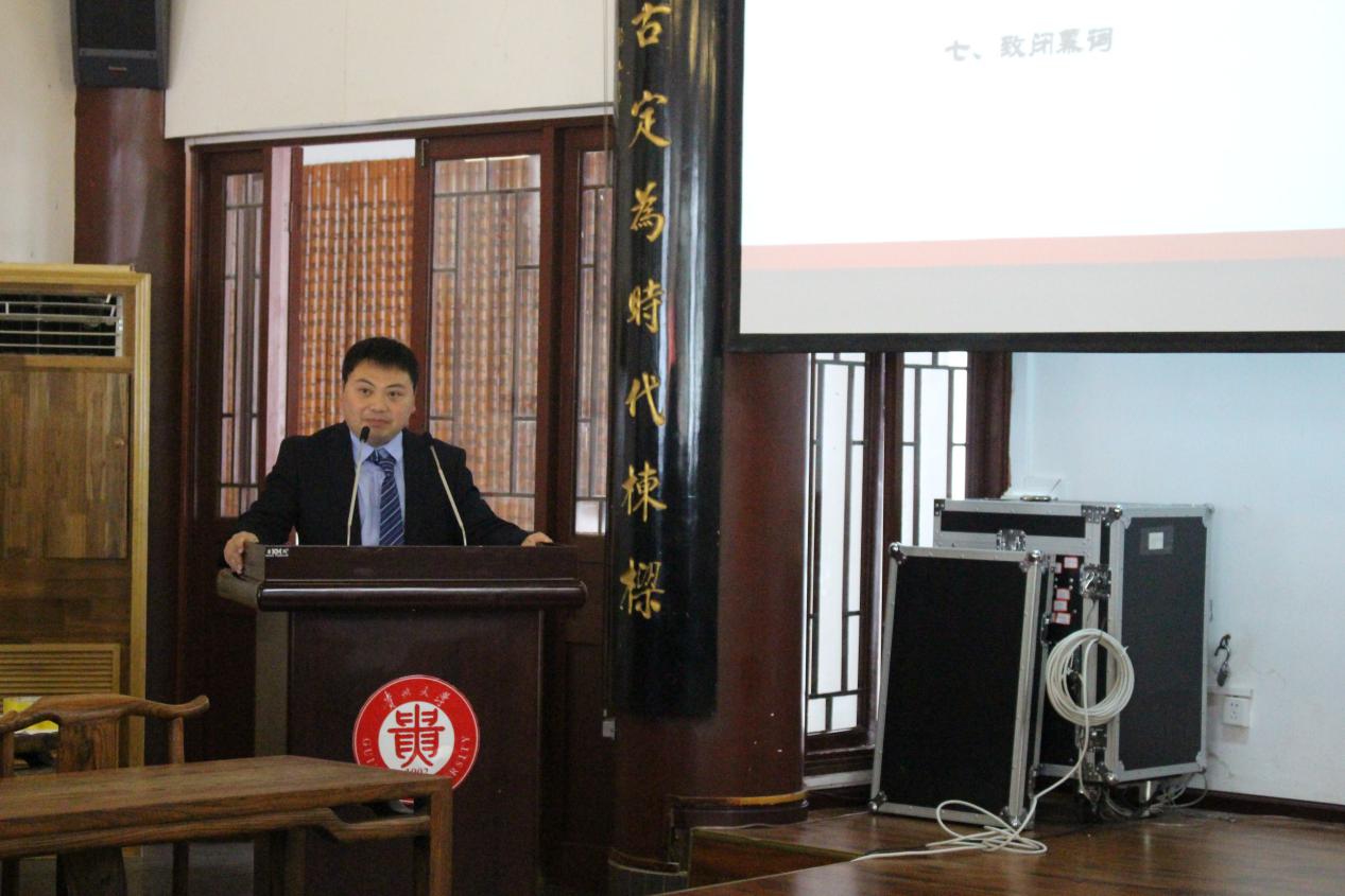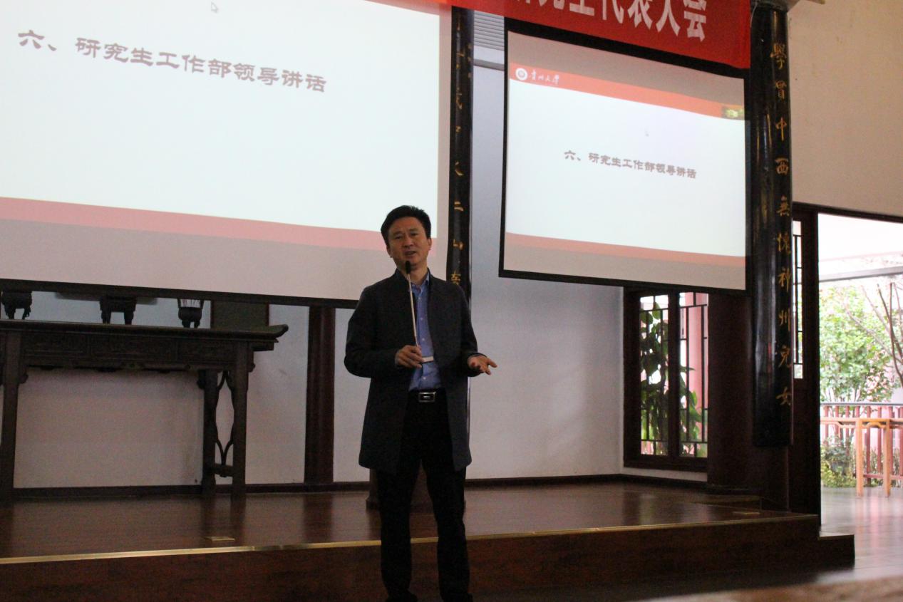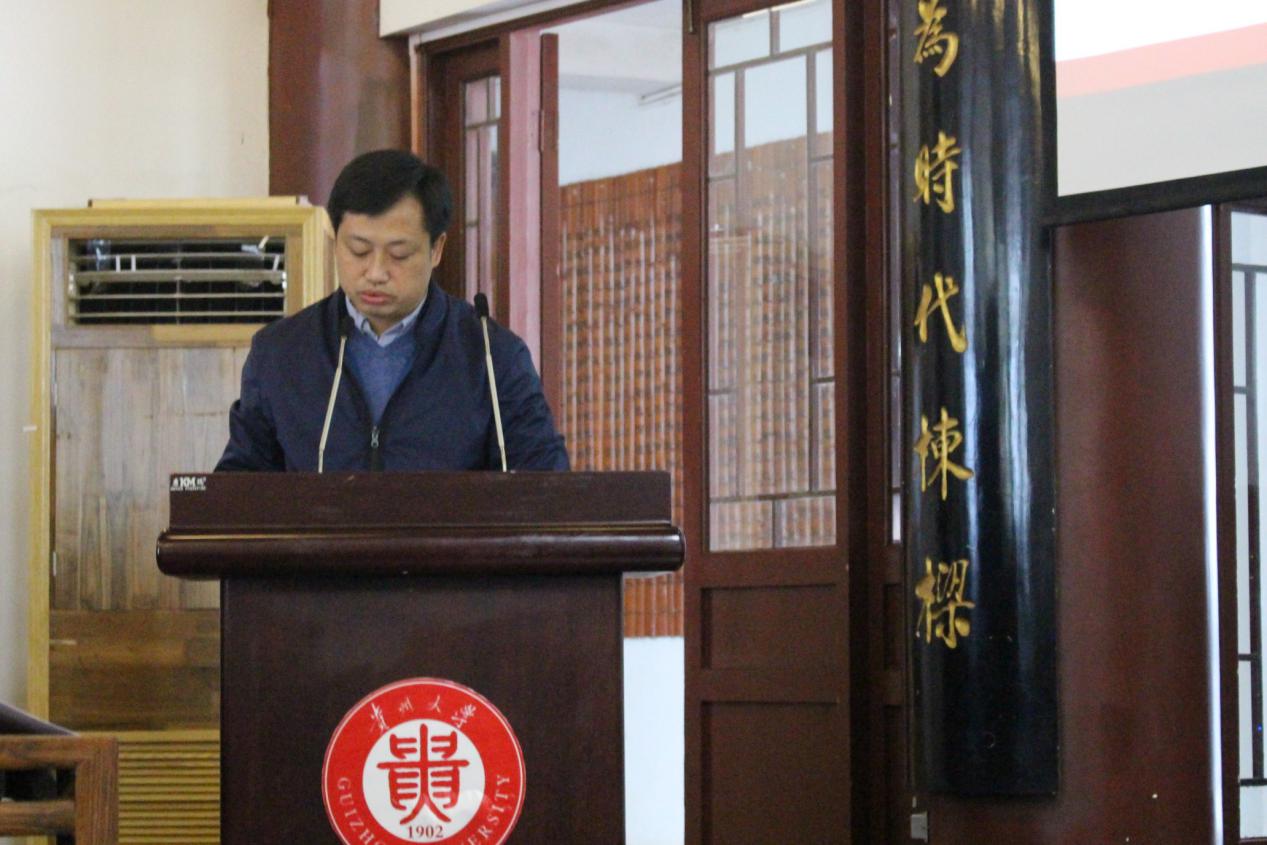 其后,校党委研究生工作部罗勇部长讲话。他充分肯定了文学与传媒学院对学校研究生工作的支持。在共同探讨“什么是贵州大学的精神”时,他鼓励我们要多向老一辈的学者学习,学习他们“至善、明德”的为人品格以及“博学、笃行”的治学态度。同时,他也对新一届委员会的工作提出以下希望。希望积极传递正能量,在相互包容与支持中共同进步;希望利用好新闻与中文的学科优势,加强与研究生会、研究生校级组织的沟通与合作,在工作中不断创新,共同推动校园新媒体的建设与发展。