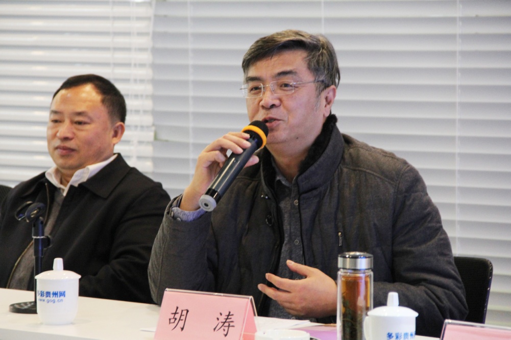 在观看了多彩贵州网宣传片后,胡涛介绍了公司“一报二平台三朵云”以及构建网站、手机报、微博、微信和新闻客户端“五位一体”新媒体矩阵等基本情况。