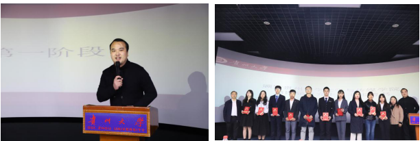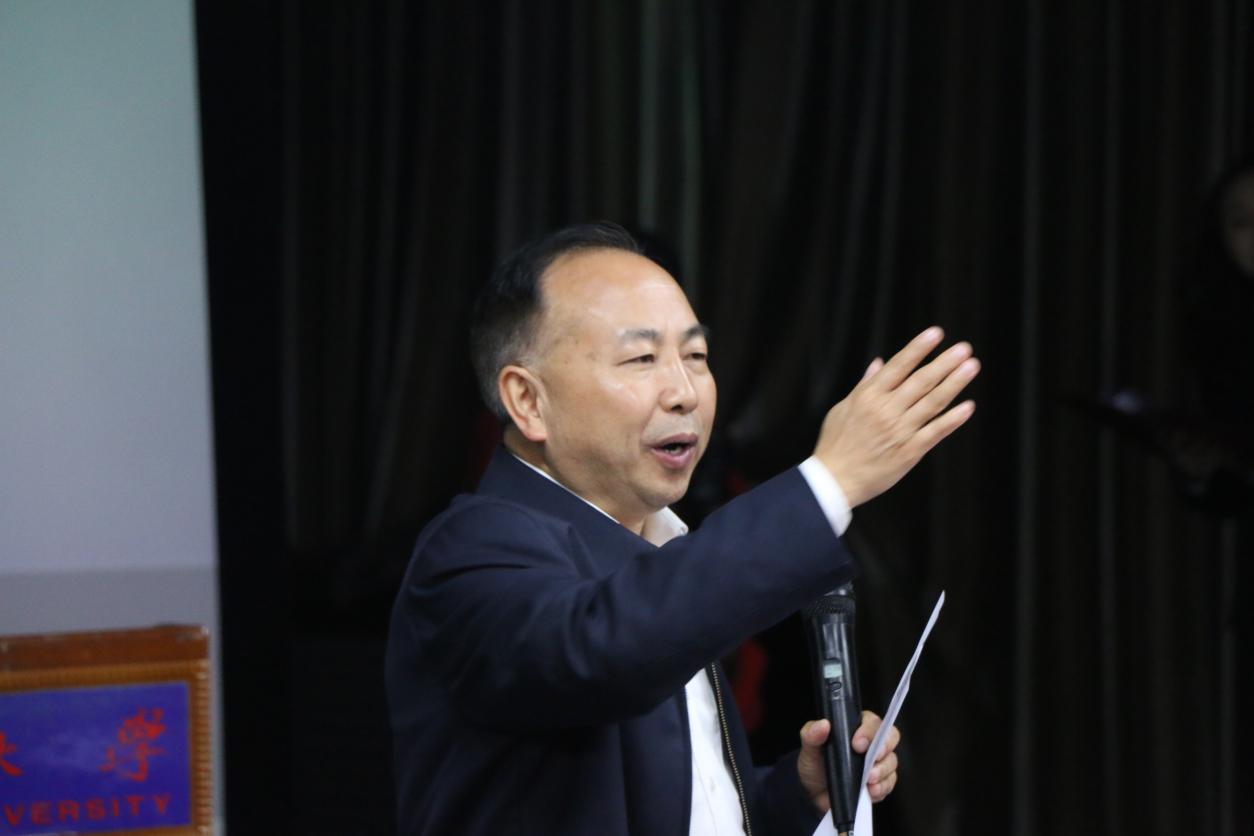 邱利军代表校党委研工部作发言,他说学院团总支与研究生会是学生的群众性组织,要坚持自我管理、自我服务、自我监督、自我教育的“四自方针”;其次,要做思想引领、学术引领、实践引领、文化引领的先进组织;并且要讲政治,讲团结,讲奉献,讲担当,打造一个有特色有品牌的学生组织。