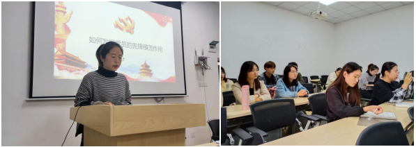 会上,研究生党员代表王菁菁同志作“如何发挥学生党员的先锋模范作用”交流发言,以自己为例说明学生党员在学习生活中要充分发挥“带头作用、骨干作用、桥梁作用”。