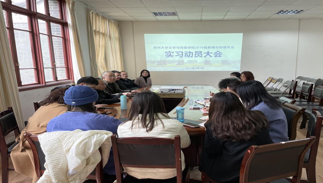 2021年3月1日下午,文学与传媒学院2019级新闻与传播专业研究生实习动员大会在人文楼204召开,院党委书记李开学、院长谭德兴及新闻与传播专业硕士培养点导师出席本次会议。会议由文学与传媒学院思政辅导员姬丹老师主持,全体2019级新闻与传播专业研究生参加。