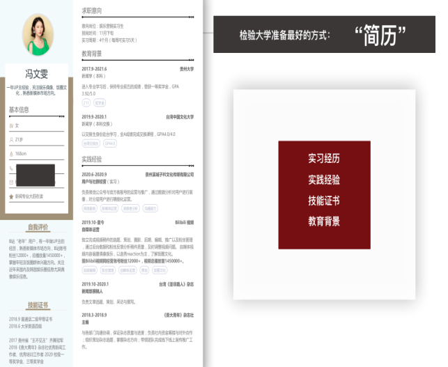 2017级新闻学专业冯文雯同学,分享了她如何进行大学学习和职业发展规划,并一点点实现自己目标的思路和方法。她从专业理论课学习、实践训练、视野拓展、大胆试错、宿舍氛围等方面展示了自己大学学习生活的方芳面面。她用“检验大学学习成果最好的方式:简历”浓缩自己的心得,她建议同学们不妨用个人简历来验证自身的努力程度,朝着目标,不断丰富简历。