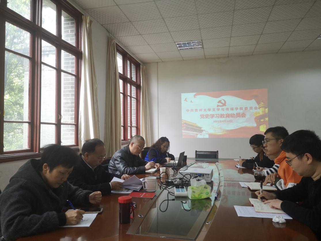 4月14日下午,贵州大学文学与传媒学院在人文楼204召开党史学习教育动员会。学院党委领导班子成员、各党支部书记、支委成员和部分师生党员参加了会议,动员会由院党委书记李开学主持。