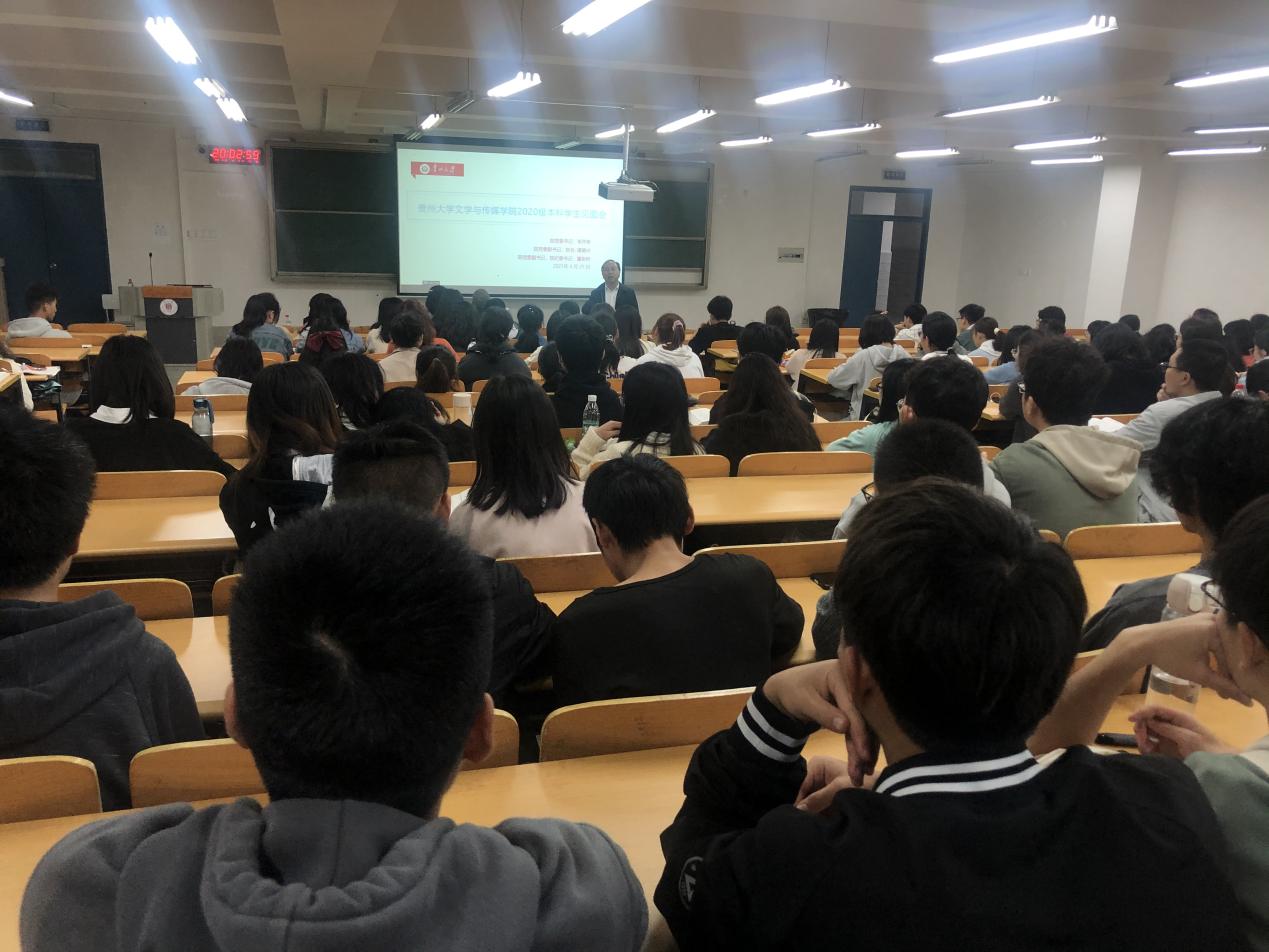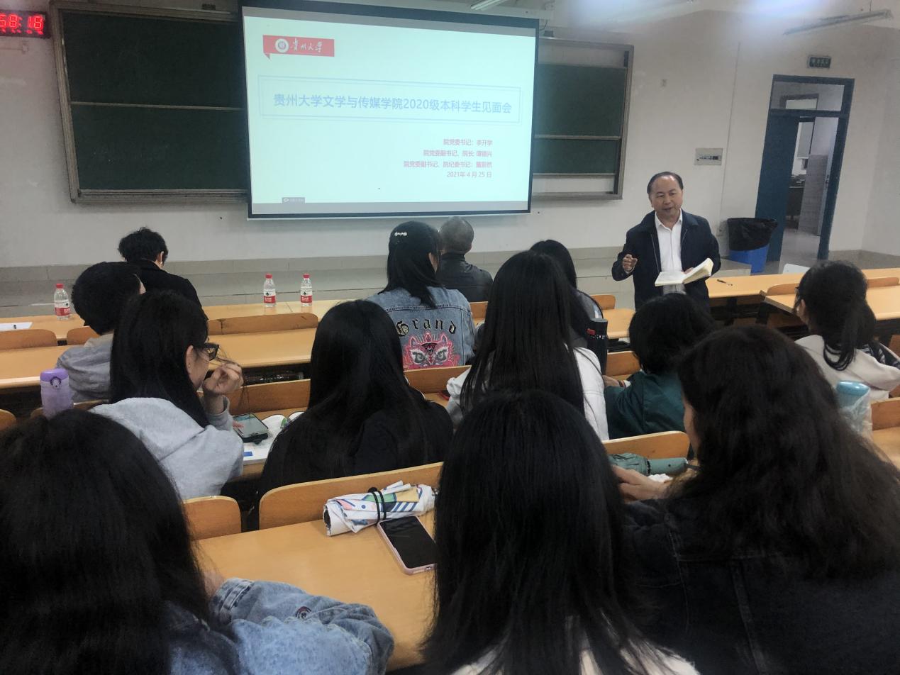 为贯彻落实《中共贵州大学文学与传媒学院委员会“牢记殷切嘱托、忠诚干净担当、喜迎建党百年”专题教育工作方案》中抓调研、破难题,重落实、办实事的指导精神,切实加强文传学院学科建设与人才培养,助力学生成长成才,2021年4月25日晚上,贵州大学文学与传媒学院在南校区致知楼102阶梯教室召开2020级本科学生见面会,院党委书记李开学、院长谭德兴、院党委副书记董蔚然出席此次见面会。
