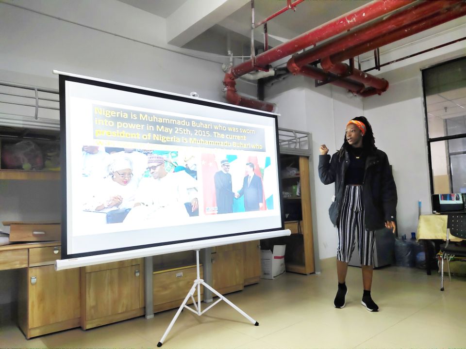 活动开始,刘雨佳用英语向同学们介绍了尼日尼亚的国旗、现任总统、首都、文化习俗、民族构成、饮食舞蹈和风土人情等基本情况。互动环节,同学们就如何学习外语、两国的生活习惯等问题进行了欢快的交流。在刘雨佳的带领下,同学们学习了尼日尼亚的舞蹈。