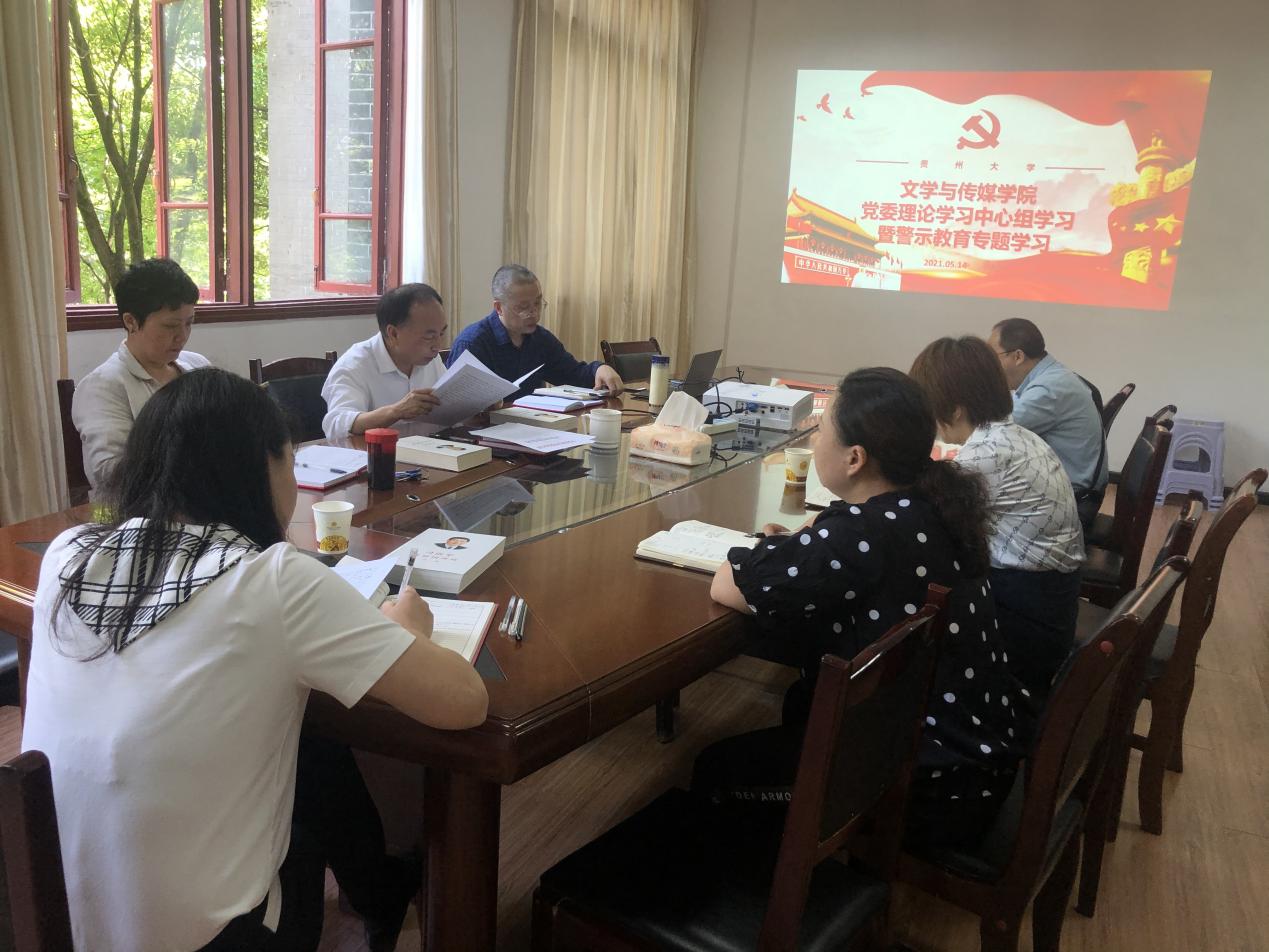 5月14日上午,文学与传媒学院在人文楼204会议室召开党委理论学习中心组学习暨警示教育学习。院党委书记李开学,院党委副书记、院长谭德兴,院党委副书记董蔚然,副院长唐娟,院党委委员、组织员姬丹,院党委委员张军出席此次会议。会议由党委书记李开学主持。