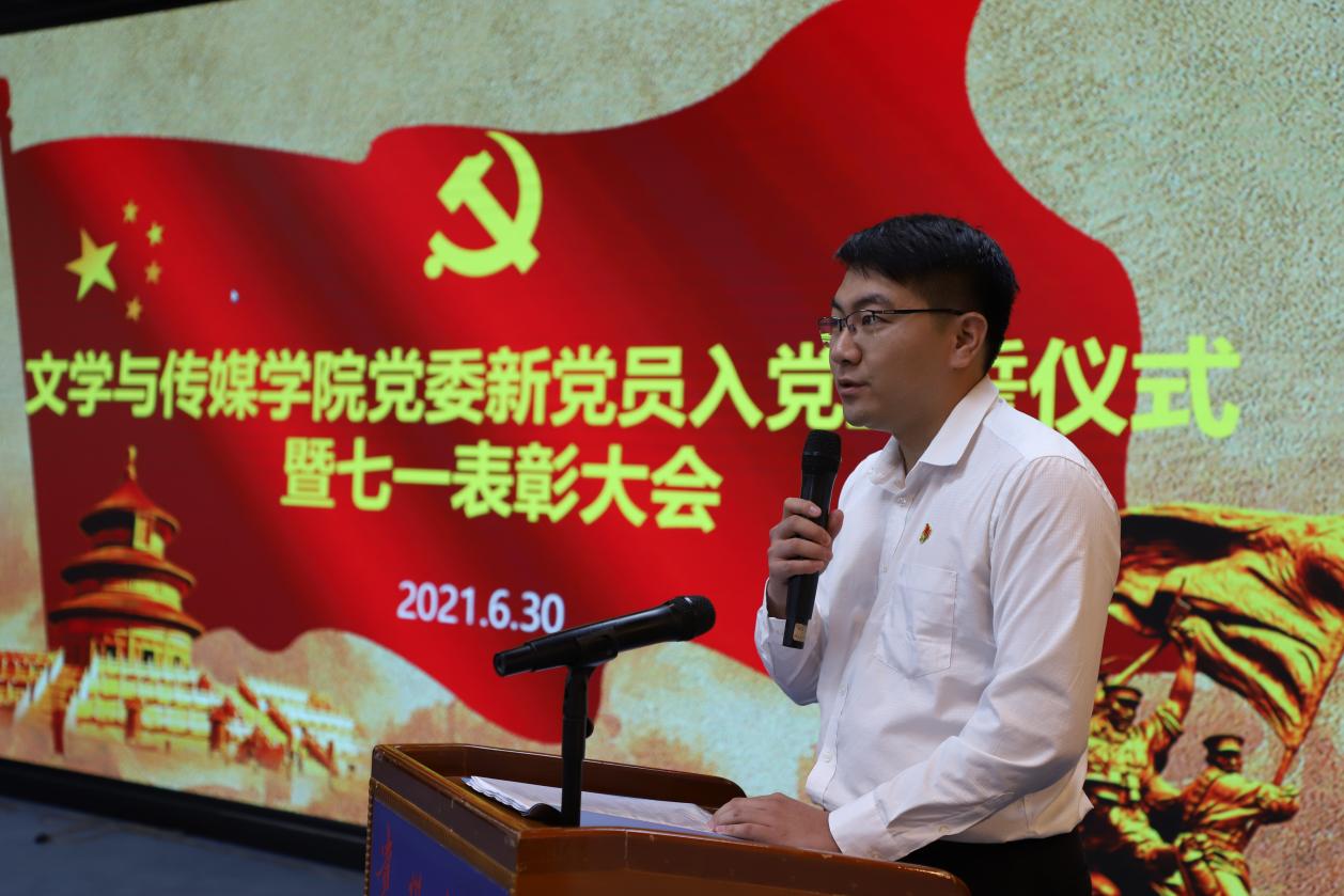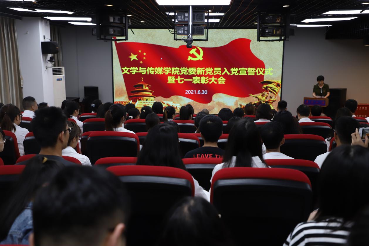 2021年6月30日上午,文学与传媒学院党委在情景模拟实验室举行新党员入党宣誓仪式暨七一表彰活动。院党委书记李开学、副书记、院长谭德兴、副书记董蔚然、副院长唐娟及全体师生党员参加了此次活动,活动由院党委副书记董蔚然主持。