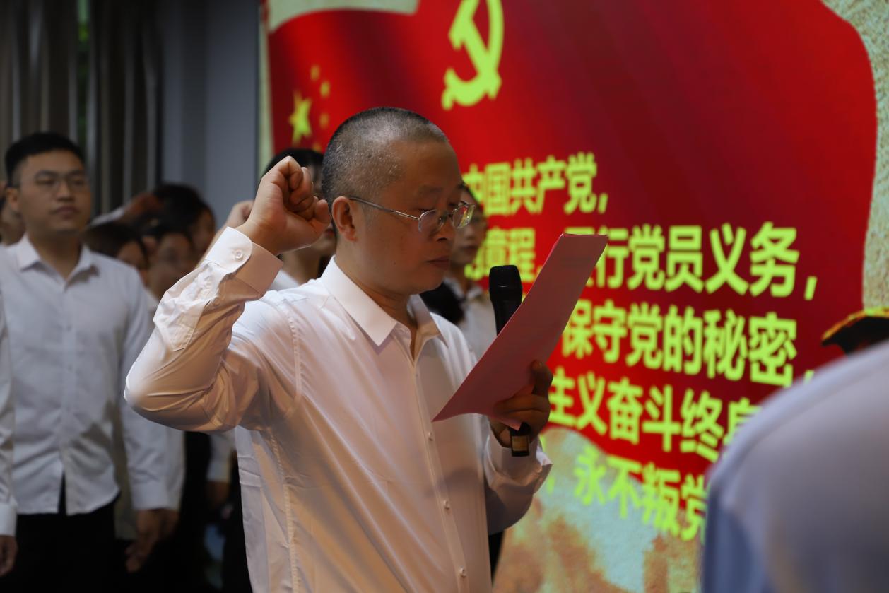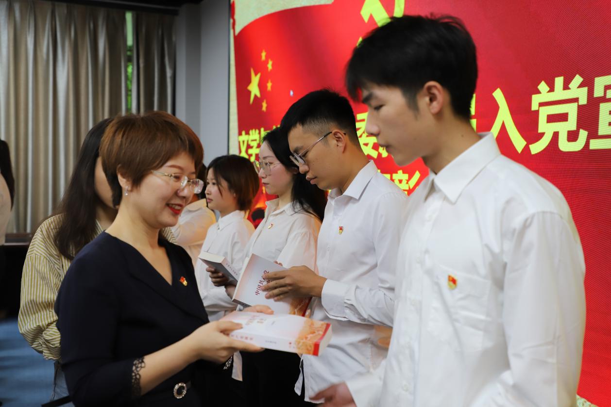 会上,院党委书记李开学宣读了院党委关于接收孙芬等49名同志为中共预备党员的批复,对新入党的同志表示热烈祝贺。院长谭德兴带领新接收预备党员面向党旗宣誓,院党委副书记董蔚然为新接收预备党员佩戴党徽,副院长唐娟为新接收预备党员发放书籍《中国共产党简史》。