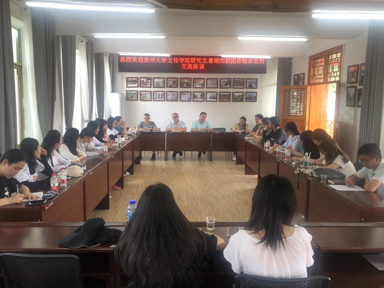 到达必克村后,文学与传媒学院一行与外国语学院党委副书记、岩鱼村驻村第一书记罗俊松,文学与传媒学院中文系教师、必克村驻村第一书记彭兴滔,必克村乡村振兴指挥部指挥长杨斌,贞丰县文化馆馆长石正荣在必克村村委会会议室开展交流座谈会。