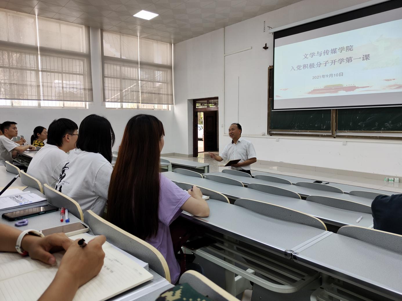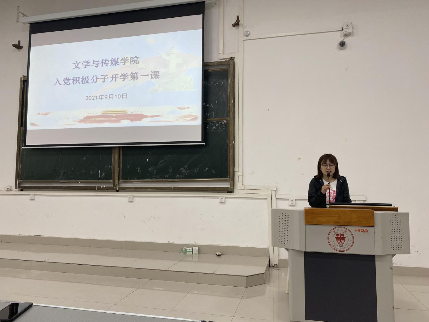为进一步贯彻落实党的教育方针,围绕贵州大学高质量发展指导思想,促进我院学生全面成才成长,确保学生党员发展质量,发挥党员及入党积极分子先锋模范带头作用,文学与传媒学院党委于2021年9月10日下午,在法学楼101DT教室召开新转入我院的2020级学生入党积极分子开学第一课。学生政治辅导员张健、曹家鹏及学院2020级全体入党积极分子150多人参加。会议由文学与传媒学院学生科科长、校团委副书记(挂职)王婷婷主持,学院党委书记李开学出席并讲话。