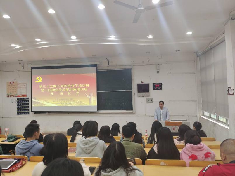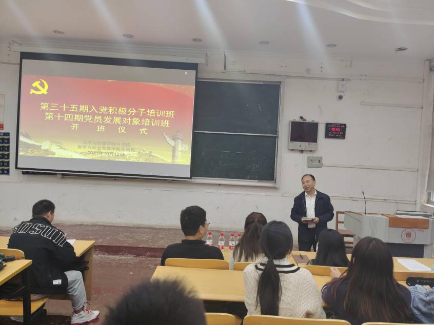 2021年10月12日下午,文学与传媒学院及哲学与社会发展学院于逸夫楼114DT举办了第十四期党员发展对象培训班暨第三十五期入党积极分子培训班开班仪式。文学与传媒学院党委书记李开学、哲学与社会发展学院党委书记周乐成、哲学与社会发展学院党委副书记黄梅、哲学与社会发展学院学生辅导员晏梦勋、文学与传媒学院学生辅导员曹家鹏出席开班仪式,开班仪式由文学与传媒学院党委组织员姬丹主持,文学与传媒学院及哲学与社会发展学院培训班全体学员80余人参加会议。