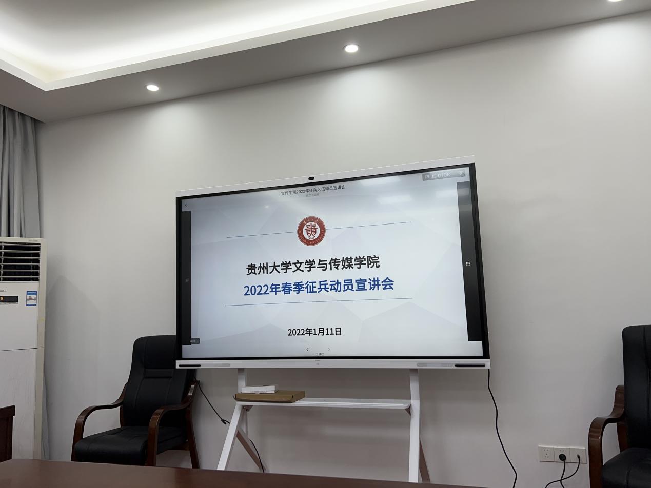 为进一步帮助我院学生了解国家征兵政策,激发我院毕业生投军报国热情,2022111日上午930,贵州大学文学与传媒学院2022学年春季征兵动员宣讲会在人文楼104举行。