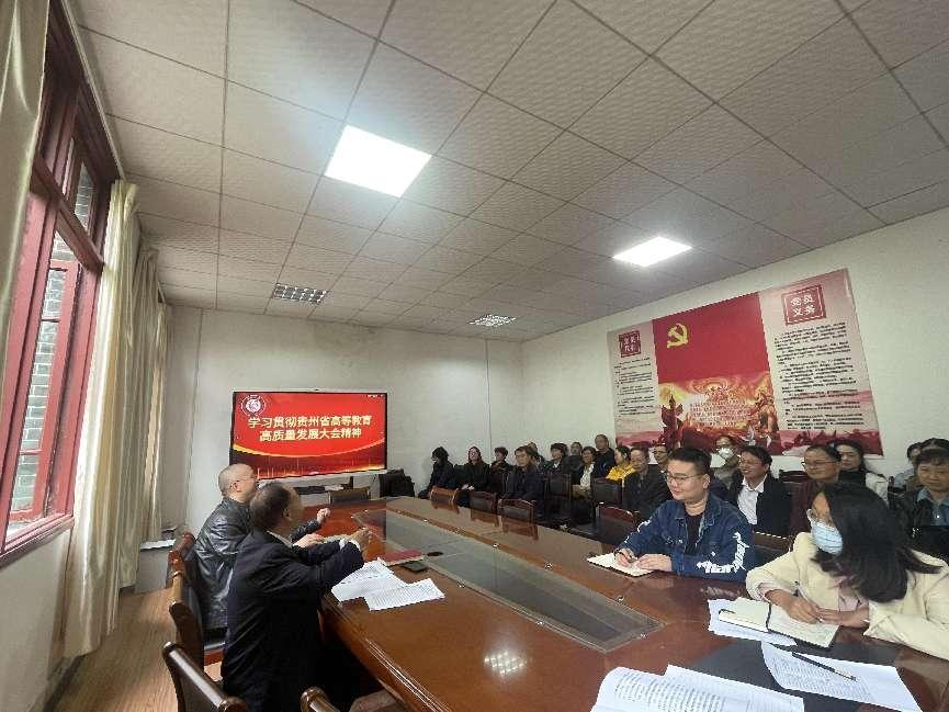 学院党委书记李开学传达学习了贵州省高等教育高质量发展大会精神;领学了省委书记、省人大常委会主任徐麟在全省高等教育高质量发展大会上的讲话精神《深入贯彻习近平总书记关于建设教育强国的重要论述,以高等教育高质量发展支撑中国式现代化贵州实践》;传达学习了贵州大学党委书记杨未在全省高等教育高质量发展大会上的发言讲话精神。