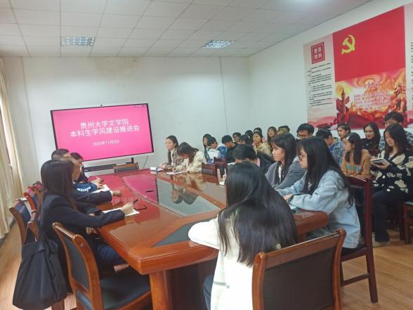 为推进学风建设,培育全面人才,营造良好的学习氛围,11月3日中午,贵州大学文学院在人文楼204会议室召开本科生学风建设推进会,文学院党委书记李开学、本科生思政辅导员曹家鹏出席会议。院学生会主要干部、各班班长、团支部书记、学习委员、党员50余人参加了会议。