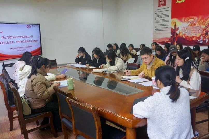 2023年11月17日,共青团贵州大学文学院研究生总支部委员会在人文楼204会议室组织开展了“溪山习政”习近平文化思想及相关内容的学习与讨论。2023级全体研究生参加此次学习,会议由文学院团总支副书记吴先兰主持。