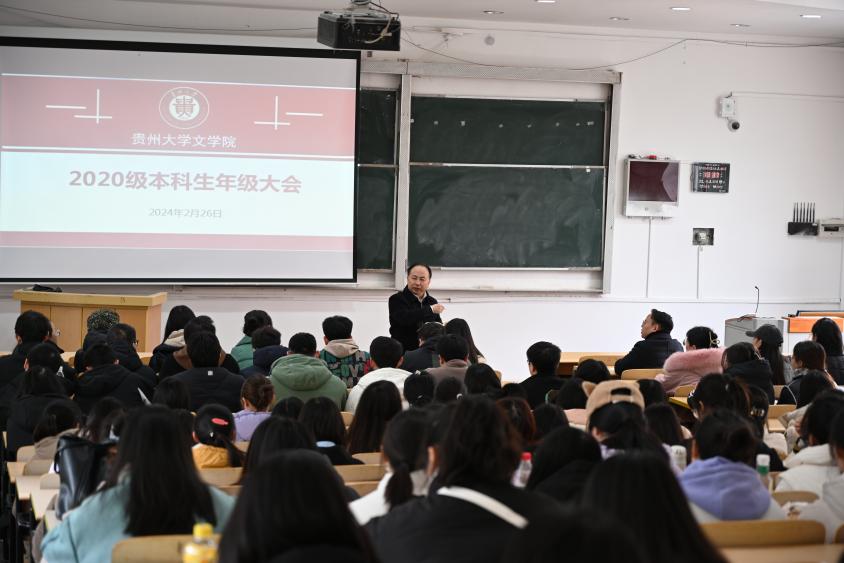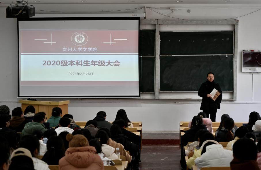 2024年2月26日中午,贵州大学文学院在逸夫楼515DT召开2020级本科生新学期年级大会。学院党委书记李开学、中文系教师彭兴滔、本科生思政辅导员曹家鹏及全体2020级本科生参加会议。会议由曹家鹏主持。