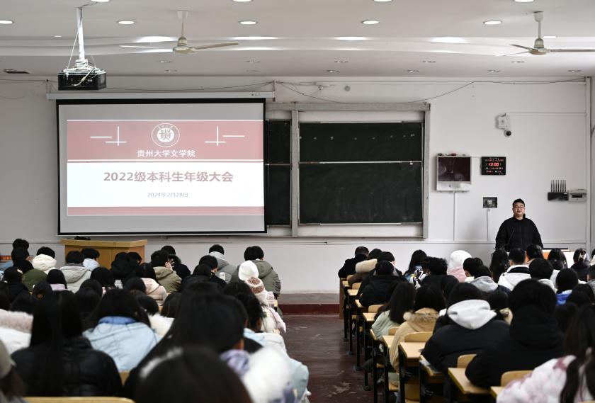 2023年2月28日中午,贵州大学文学院在逸夫楼515DT召开2022级本科生新学期年级大会。学院党委书记李开学、本科生思政辅导员曹家鹏及全体2022级本科生参加会议。会议由曹家鹏主持。