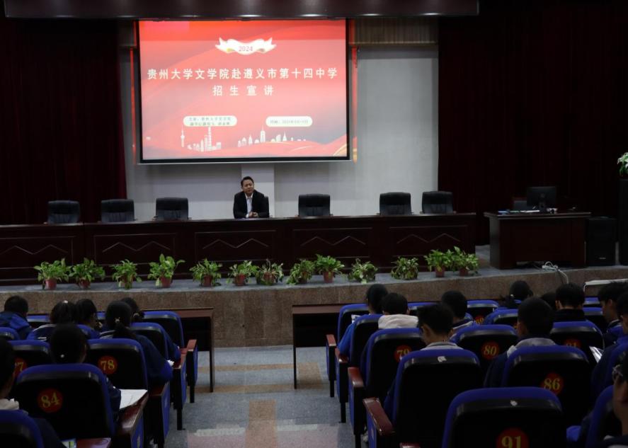 根据贵州大学2024年招生工作安排,进一步提高学生质量。2024年3月14日,贵州大学文学院党委书记李开学、副书记院长谭德兴、副书记兼副院长赵永刚、党政办公室副主任肖玉婷、学生科辅导员曹家鹏以及学生代表赴遵义市第十四中学开展招生宣讲。遵义市十四中党委书记罗仕友、党委副书记校长谢清清、党委副书记唐德龙、党委委员纪委书记王强、党委委员副校长饶天勇、党委委员副校长余世兵、党委委员副校长郭长亮、教务教研主任罗红艳及学生300余人参加宣讲。贵州大学文学院副书记兼副院长赵永刚在遵义市十四中大礼堂作招生宣讲。