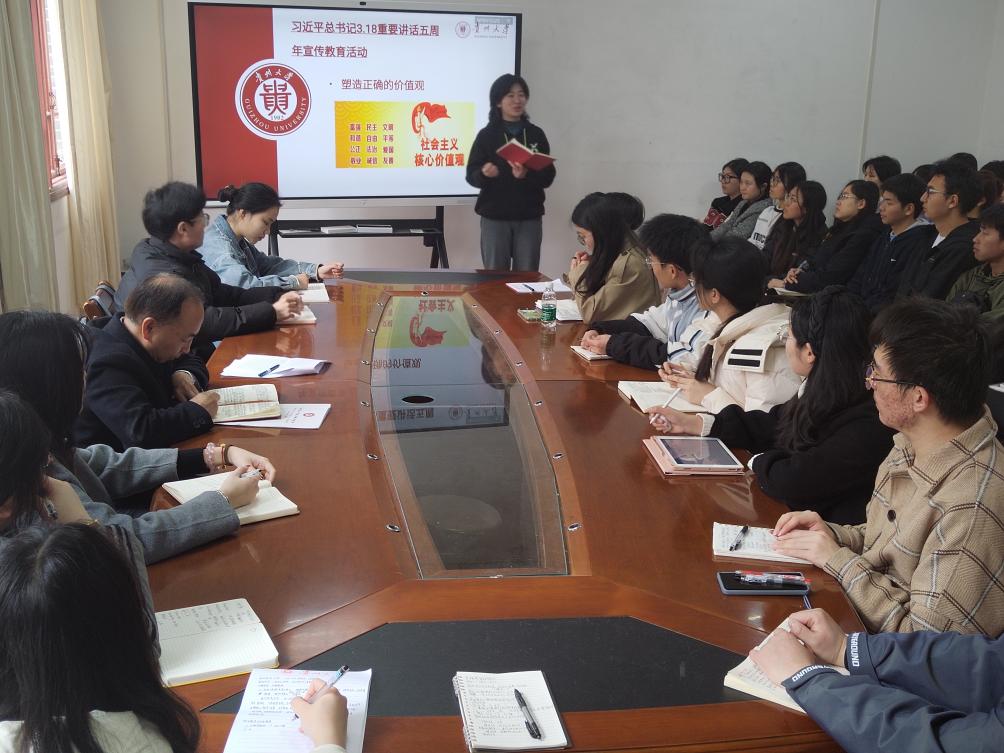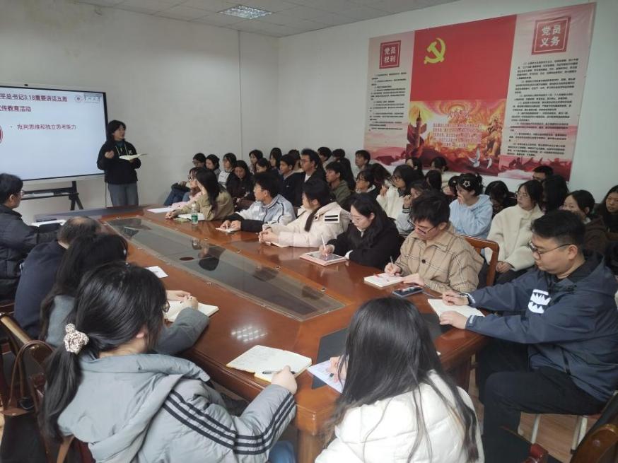 为增强青年学子的政治素养和思想觉悟,2024年3月20日,我院于人文楼204会议室开展了“理论宣传二人讲”宣传学习习近平总书记3·18重要讲话。院党委书记李开学和院学生会主席袁艺分别担任思政课教师主讲人和学生主讲人进行宣讲,院团委全体干部、学生会全体干部、汉语2101团支部全体同学参与学习。