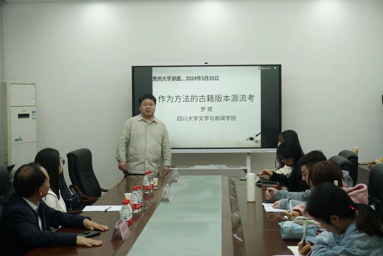 2024年3月30日下午,由贵州大学人文社科处主办,贵州大学文学院承办的贵州大学总第931期“溪山论道·文科讲坛”(2024年第5期)在贵州大学文学院104会议室举行,四川大学文学与新闻学院教授、博士生导师、副院长罗鹭进行讲授。贵州大学文学院副教授付星星担任本次学术讲座主持人,贵州大学文学院党委书记李开学以及贵州大学文学院硕士生聆听了讲座。