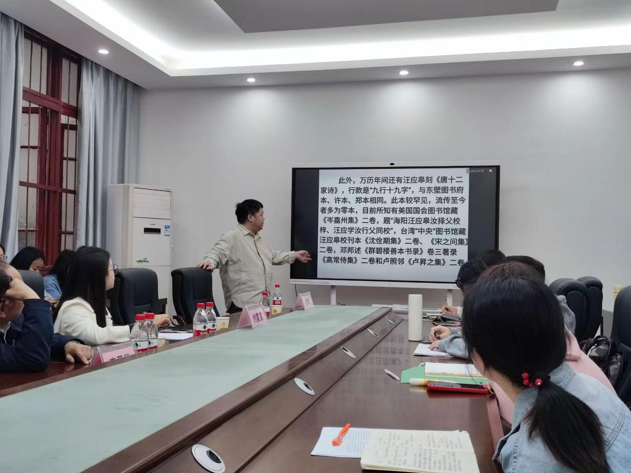 其次,罗教授以周勋初先生的《<唐十二家诗>版本源流考》为例,梳理了明刻本《唐十二家诗》的版本情况:佚名编,明嘉靖前期重印正德仿宋唐人诗集本;张逊业编,明嘉靖三十一年(1552)黄埻东壁图书府刊本;杨一统编,明万历十二年(1584)刊本;许自昌编,明万历三十一年(1603)霏玉轩刊本;郑能编,明万历年间闽城琅嬛斋刊本;汪应皋编,明万历年间刊。通过版式特征、版本的文字校勘等方式对上述几种版本进行对比分析,得出如下结论:明嘉靖前期重印正德仿宋唐人诗集本源于南宋书棚本,东壁图书府刊本根据正德仿宋唐人诗集本校刻,万历以后刻本大多是依据东壁图书府本翻刻的。
