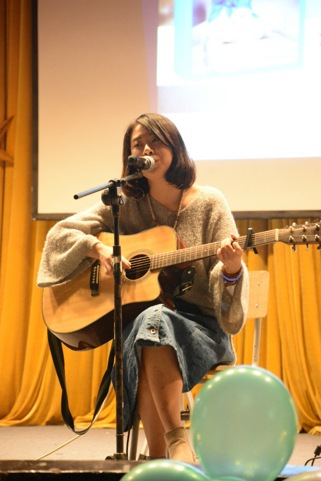 最后为大家演唱的是来自贵阳的女歌手叶子,清新犹如泉水的声音,细细的像和老友漫谈一般娓娓道来自己的故事,一首献给飞行员的《Flying life》,献给学长的《他》,每一首歌背后都有它的故事。最后叶子唱了一首孙燕姿的《遇见》作为结束,她笑着说“遇见你们是最美丽的意外”。
