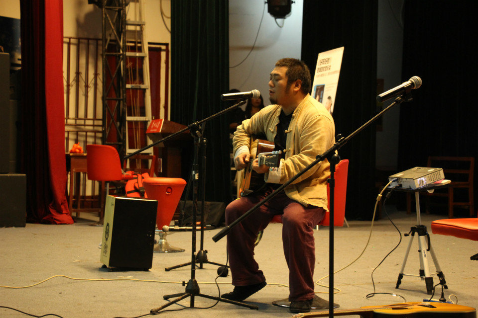 千呼万唤始出来,接下来是“野生”流浪歌手老谢出场。他沙哑的声音很好的诠释了那些略显沧桑的歌曲。老谢还跟大家分享了自己在农村的童年生活,当北漂的辛酸经历,当丽漂的辗转颠沛。