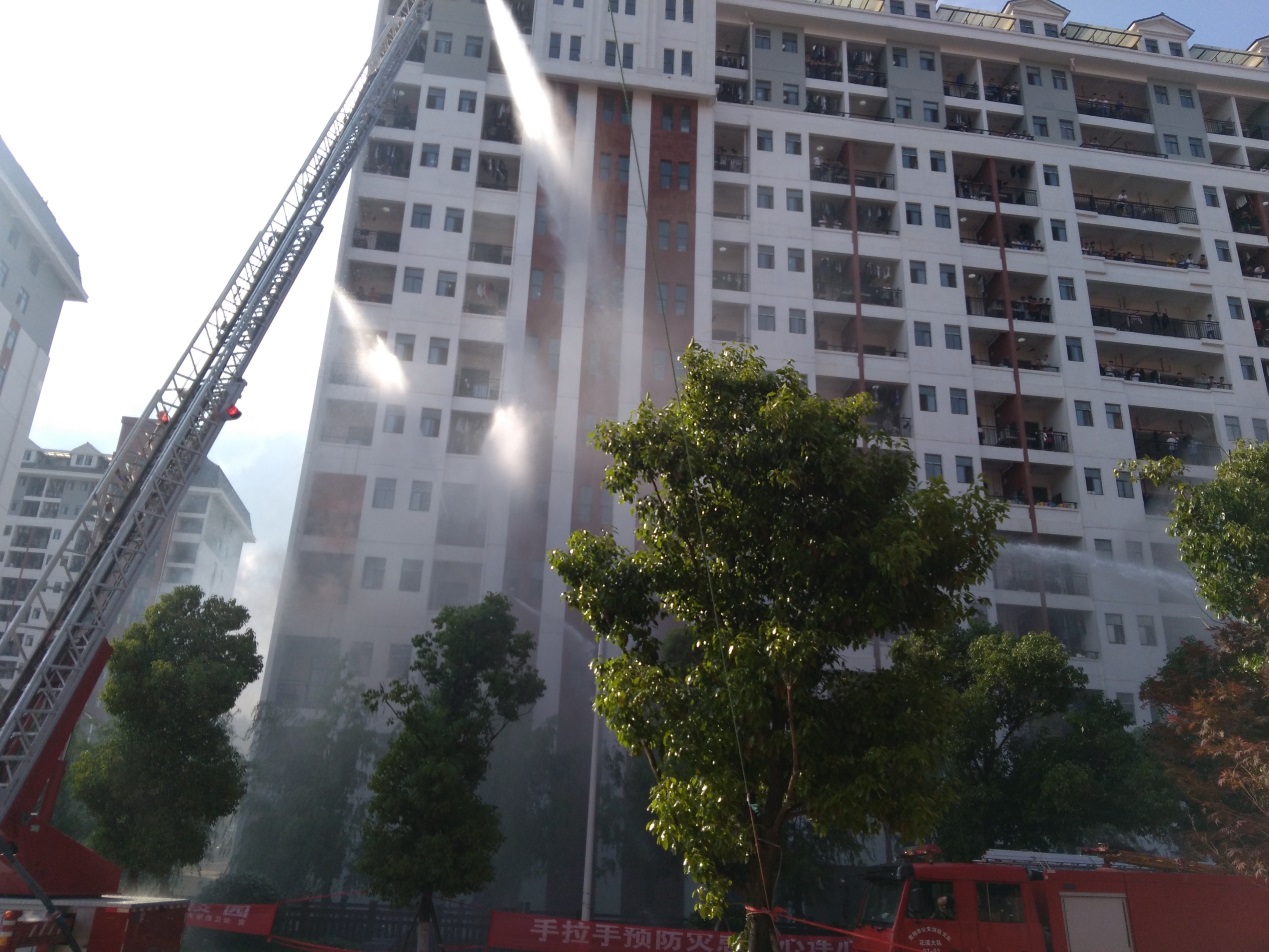 下午430时,演练开始。18栋宿舍开始散发出层层浓烟,消防车、救护车迅速赶到,展开救火工作。