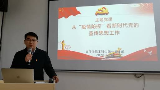 新闻系教工党支部书记张波副教授以学习“全国抗击新冠肺炎疫情表彰大会重要讲话精神”为主题,从回顾抗议斗争重大战略成果、解密抗疫“制胜密码”以及“中国精神”“中国力量”“中国担当”几个方面诠释了伟大抗疫精神。