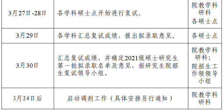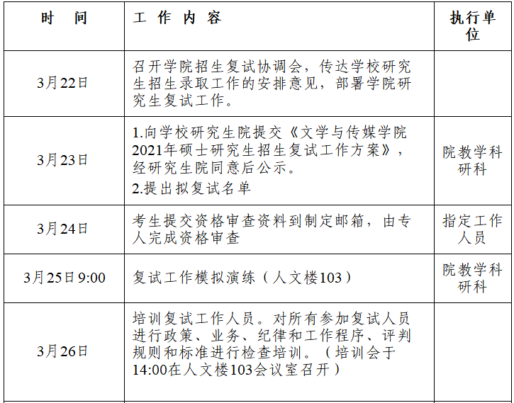 文学与传媒学院2021年硕士研究生招生录取复试工作进程及时间安排见下表。