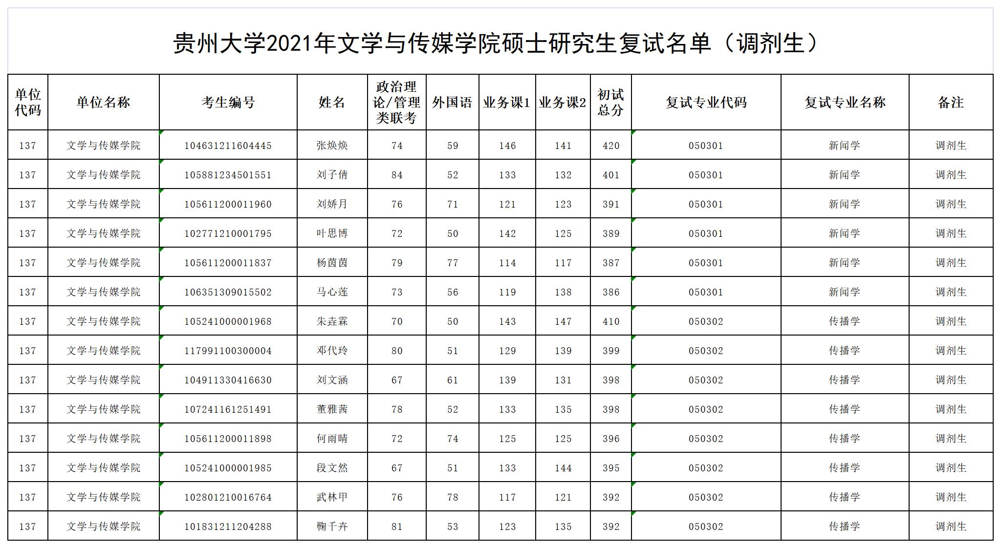 贵州大学2021年文学与传媒学院硕士研究生复试名单(调剂生)