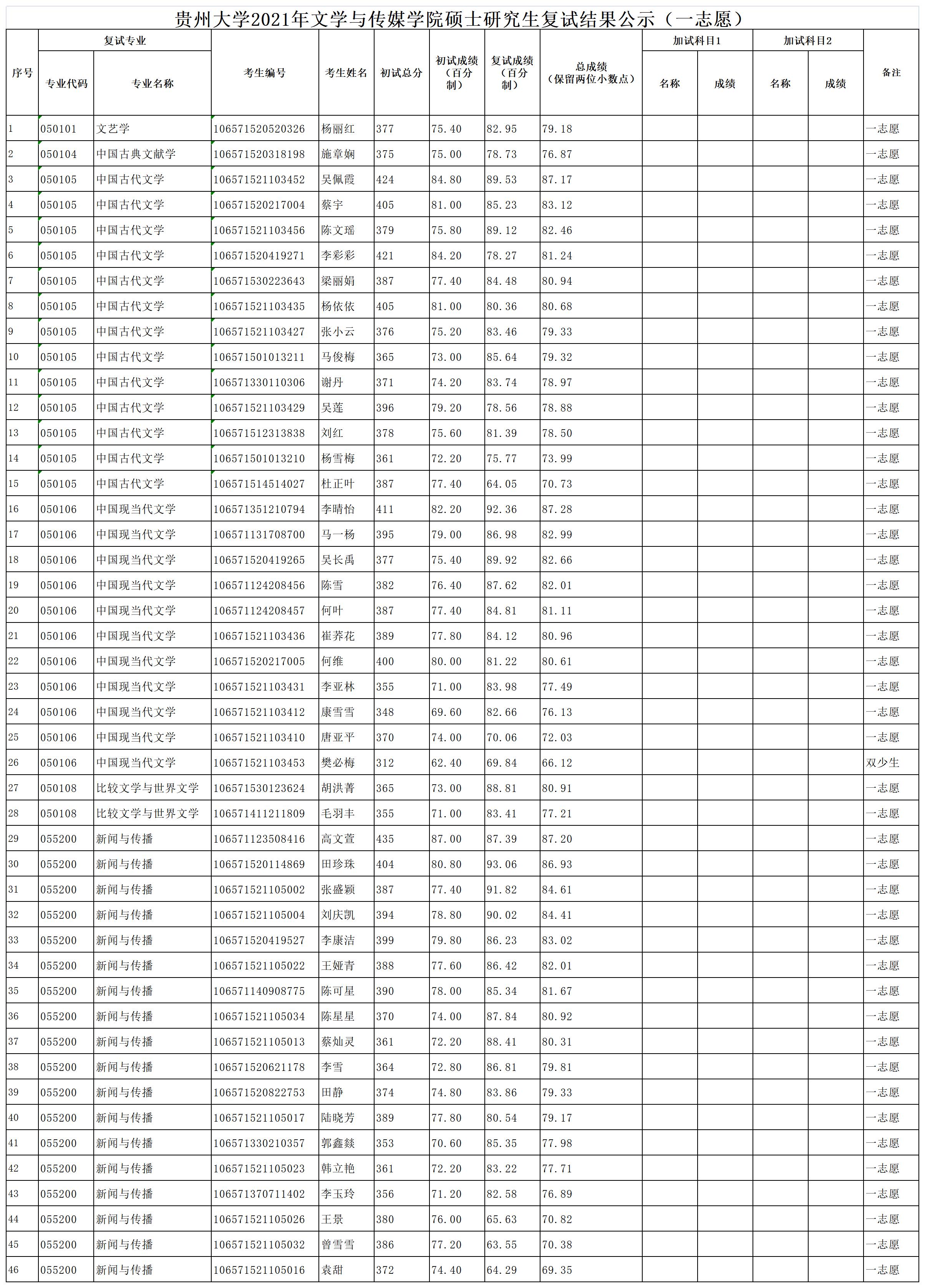 贵州大学2021年文学与传媒学院硕士研究生复试结果公示(一志愿)