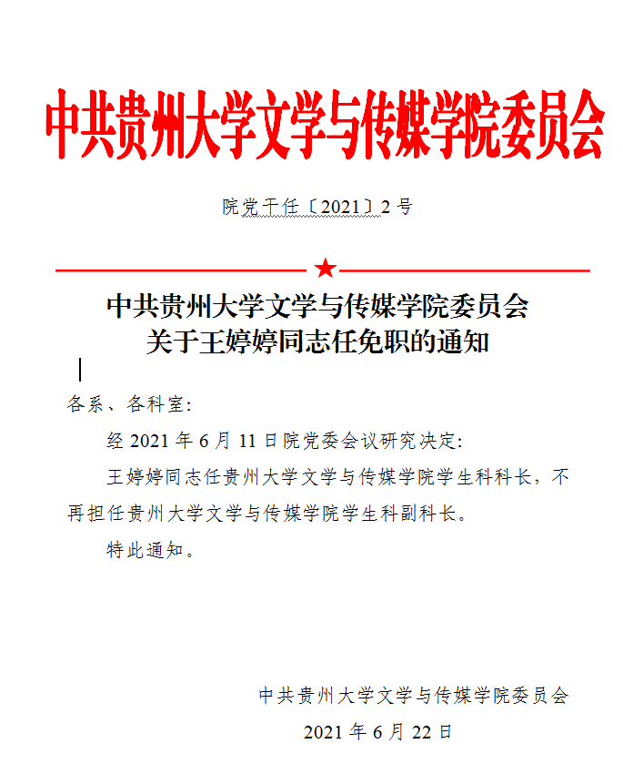 关于王婷婷同志任免职的通知