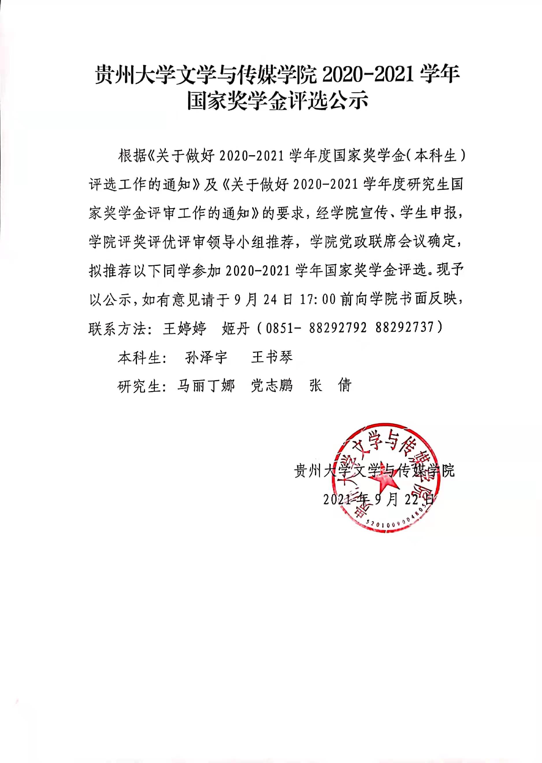 贵州大学文学与传媒学院2020-2021学年国家奖学金评选公示