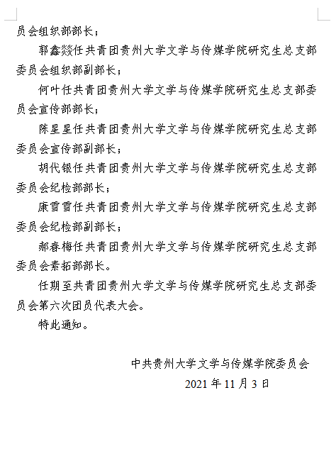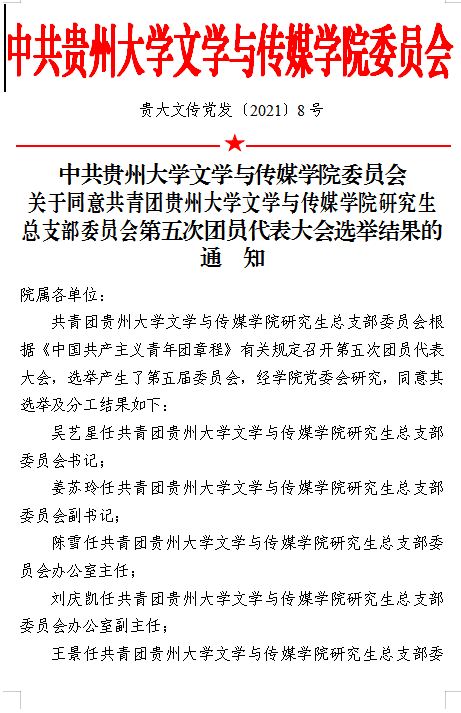 关于同意共青团贵州大学文学与传媒学院研究生总支部委员会第五次团员代表大会选举结果的通知