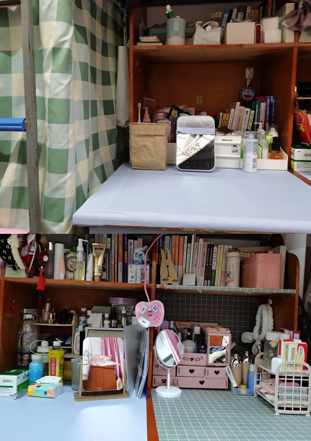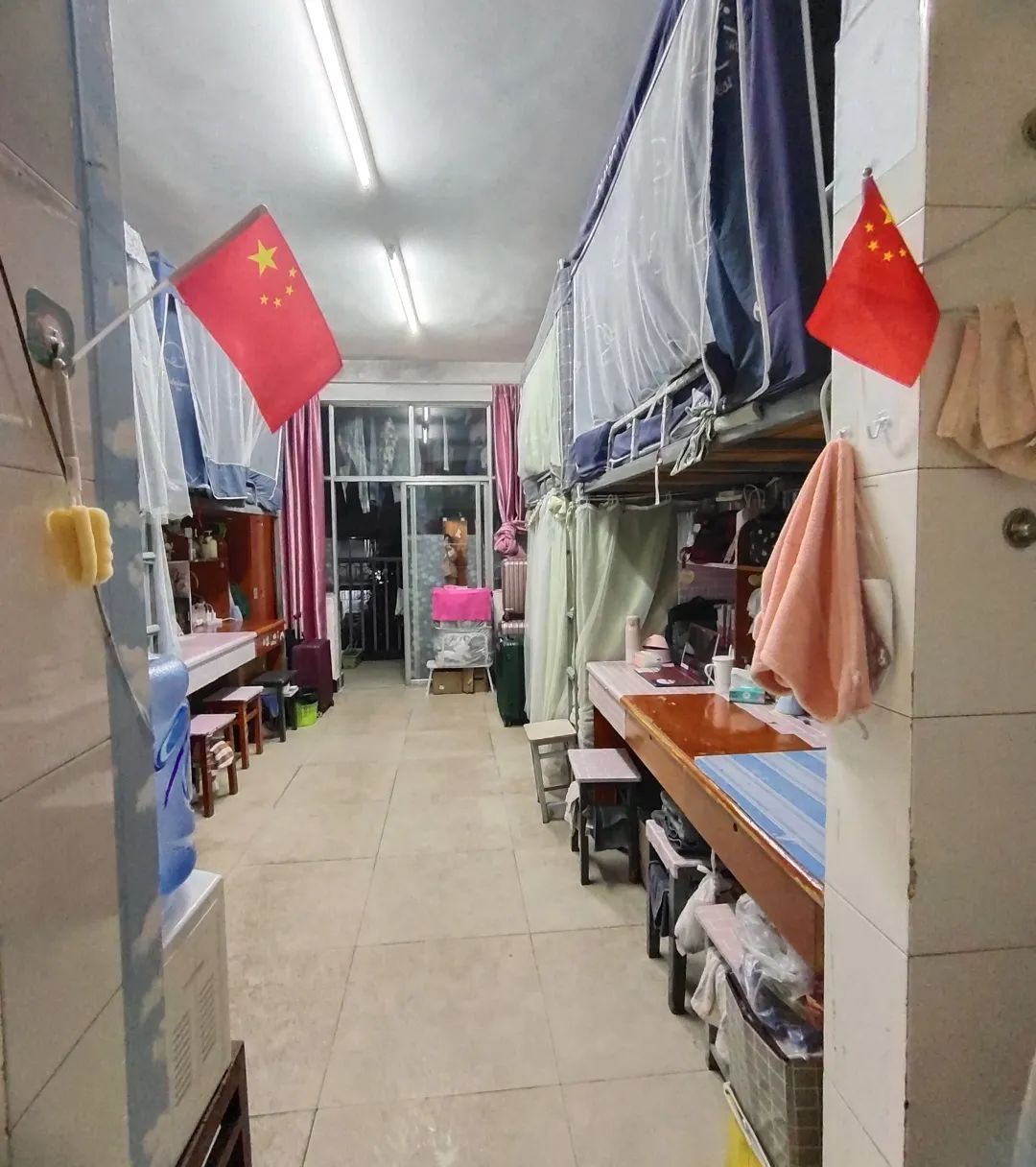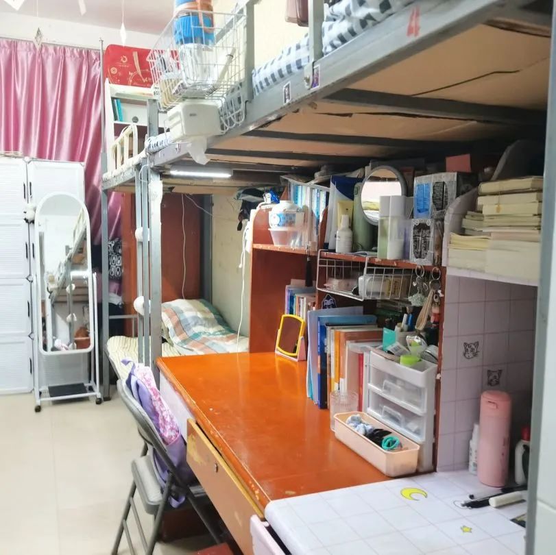 寝室的香槟色窗帘尽显欧式风格,各个桌子摆放整齐,桌面无垃圾,个人物品摆放整齐。无乱贴乱画现象,空气清新,地面干净。