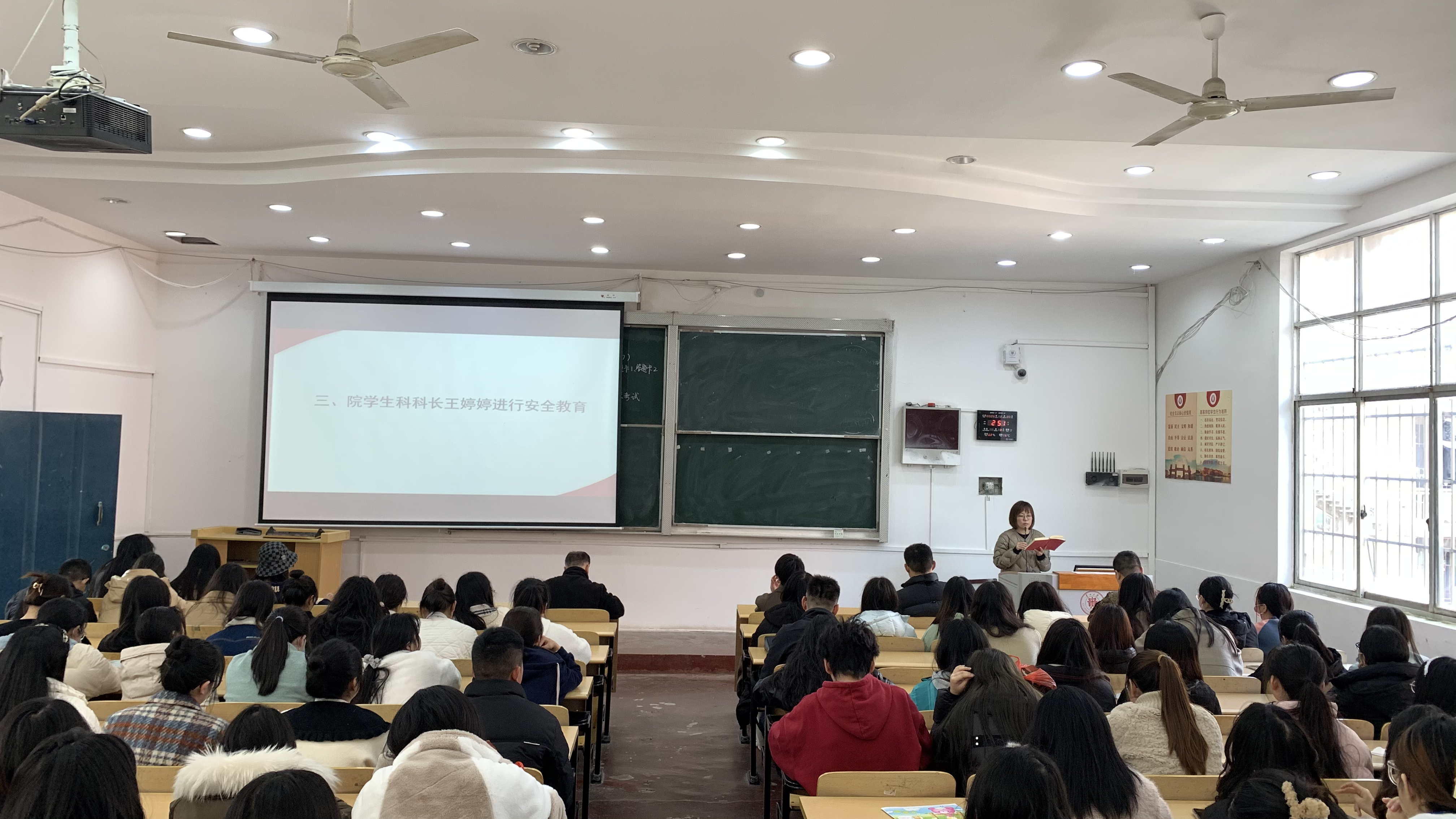 学生科科长王婷婷进行安全教育。她提醒同学们要做自己健康的第一责任人,密切关注自身身心健康,有问题及时向老师反映;要珍爱生命,严禁酗酒与下河游泳;严禁在寝室使用明火、大功率电器;求职期间,要注意辨别求职陷阱,严防网络诈骗,提高警惕以人保护自身财产安全;在军训期间要严格遵守校纪校,不得违规外宿。