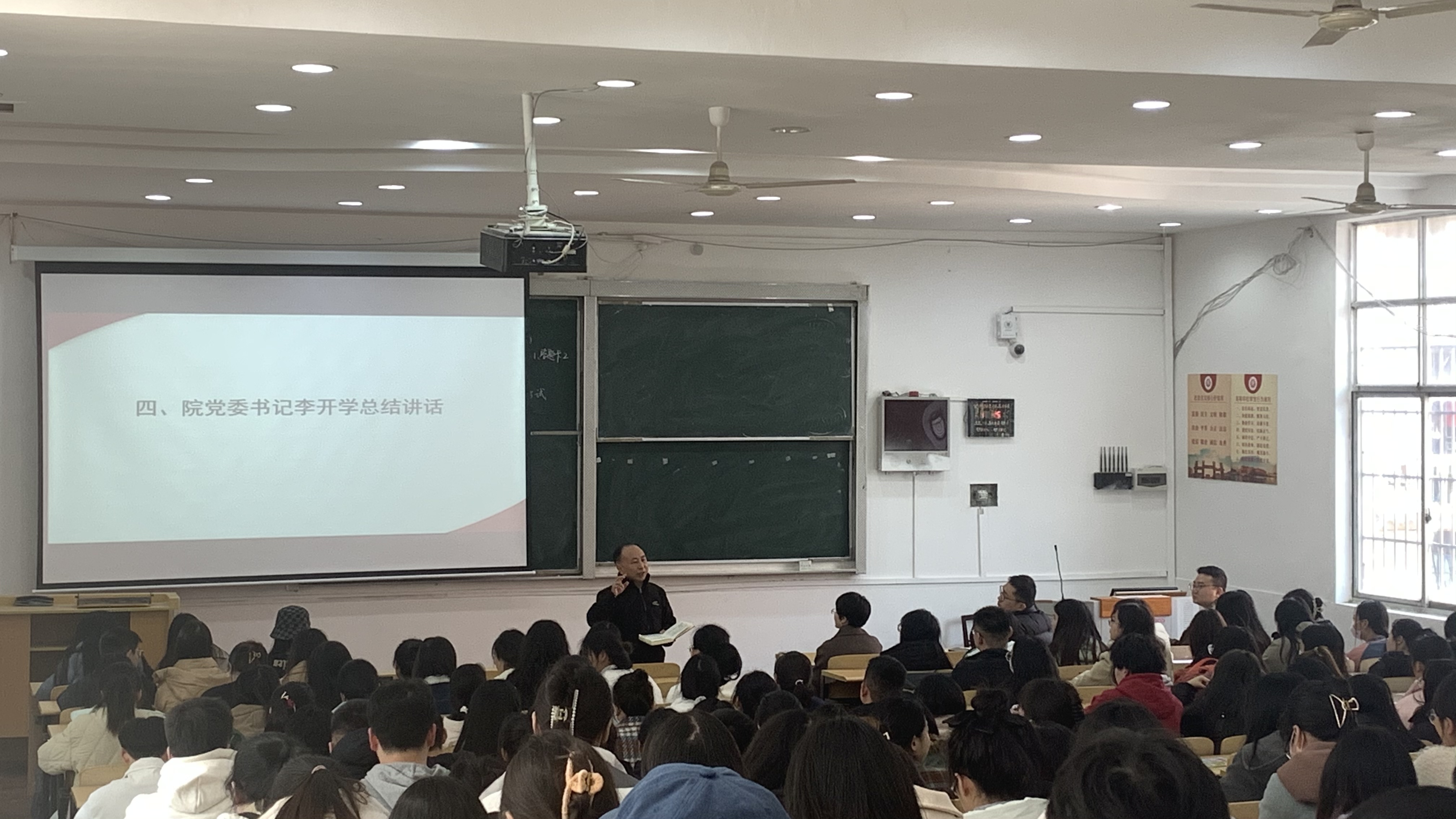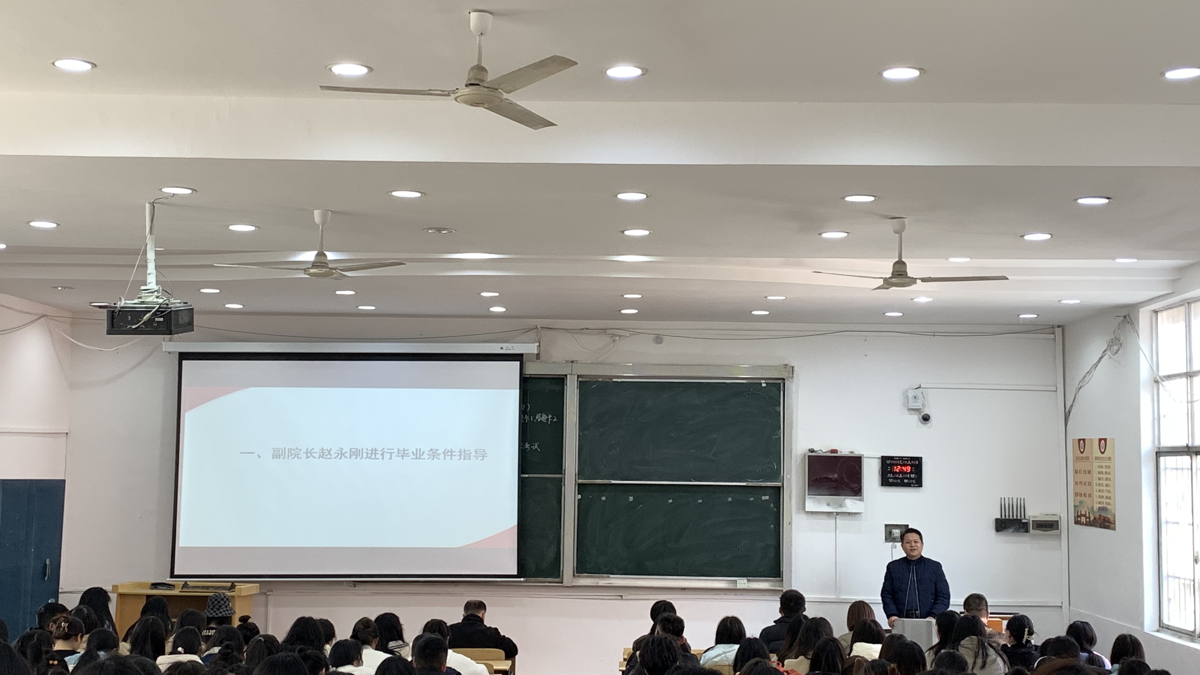 副院长赵永刚为全体同学做毕业条件讲解。他具体讲解了本科生毕业要求、博学课程学分兑换等问题,重点对如何有效完成毕业论文做了有益指导。