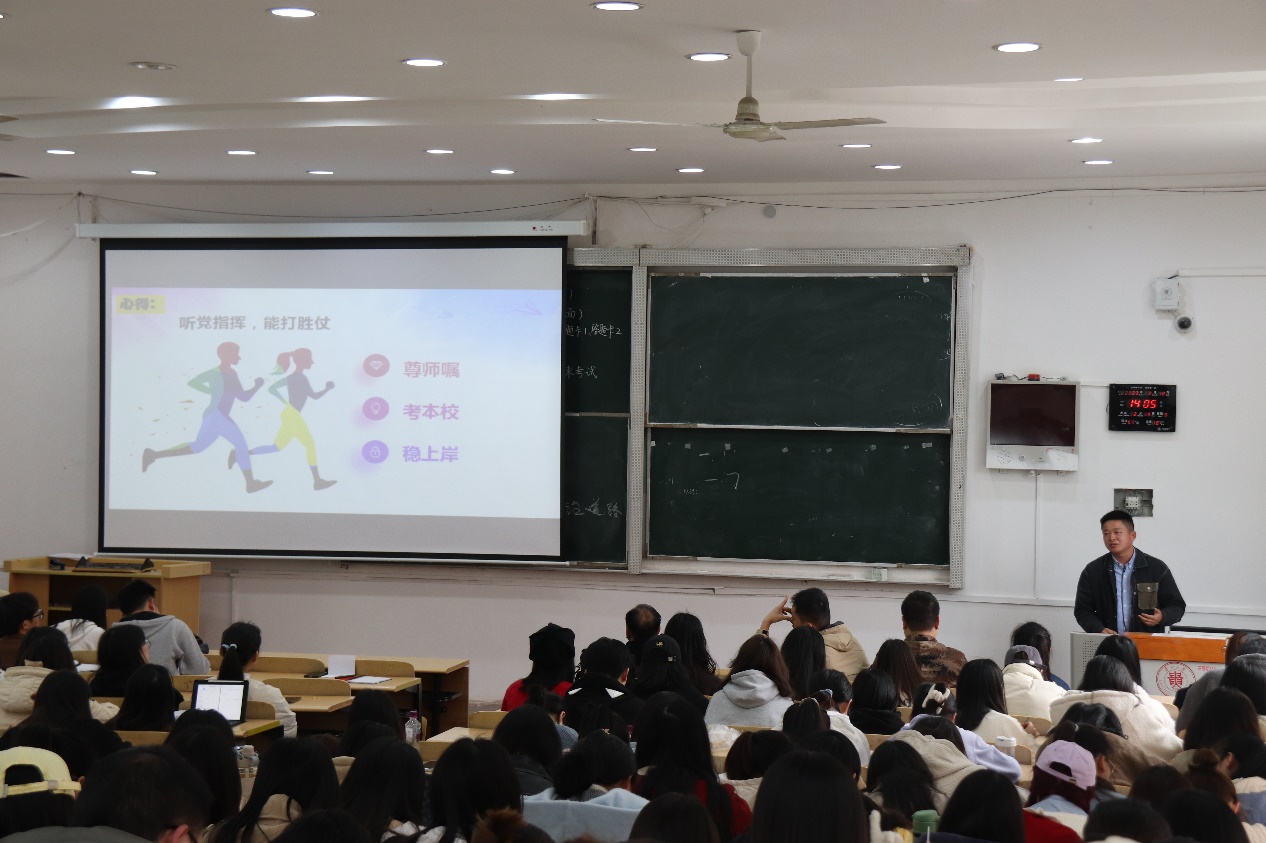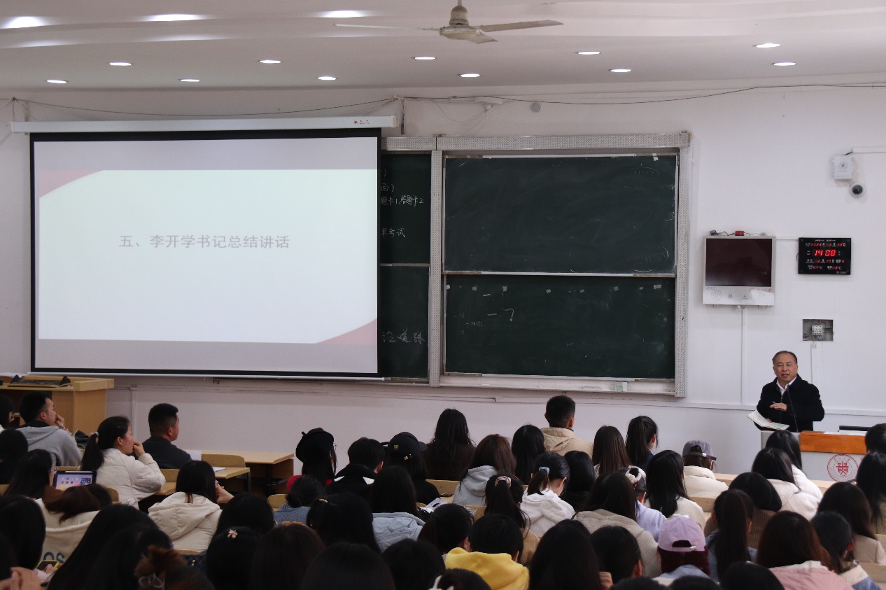 李开学总结讲话。他对同学们强调:一、要提高政治站位,要增强“四个意识”,坚定“四个自信”,做到“两个维护”,不断在政治上、人格上、人品上趋于成熟,成为具有坚定理想信念、能担当天下大任的大学生。二、要坚定考研信念,要积极参与博学计划,及早进入复习状态,不断提升与发展自己,拒绝“躺平”。三、应征入伍是爱国爱党的光荣事业,我院学子要心怀国家,积极参军入伍。