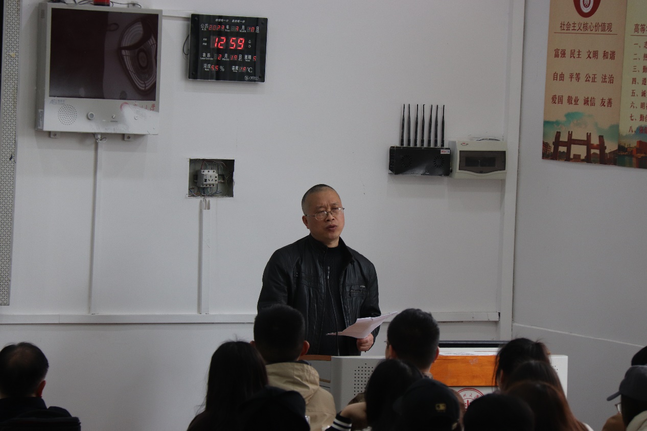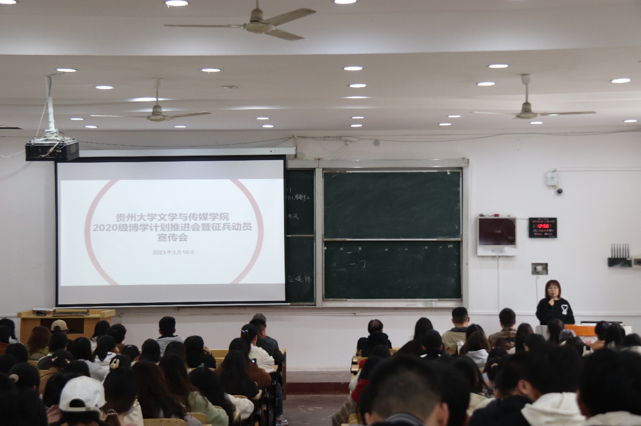 3月10日下午,贵州大学文学与传媒学院于逸夫楼515DT召开2020级本科生“博学计划”推进会暨征兵动员宣传会。院党委书记李开学、党委副书记院长谭德兴、党委副书记副院长唐娟、学生科科长王婷婷、本科生思政辅导员及全体2020级本科生参加会议。会议由学生科科长王婷婷主持。