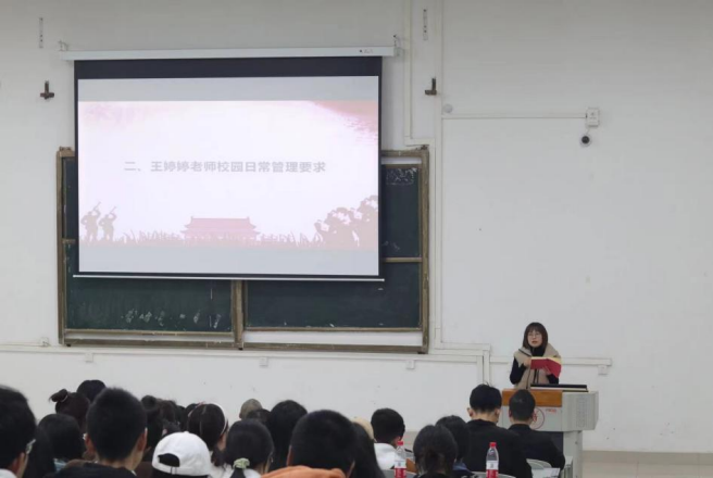 王婷婷对校园常管理要求进⾏讲解。她提醒同学们要遵守校规校纪共同维护校园秩序;要严格执请销假流程,不得违规外宿;要做好学习的 本职⼯作,做好课堂考勤;要处理好际关系。